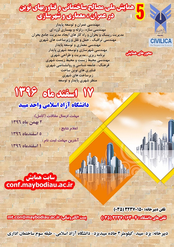 به گزارش گالري آنلاين به نقل از روابط عمومي همايش، پنجمين همايش ملي مصالح ساختماني و فناوريهاي نوين در عمران، معماري و شهرسازي هفدهم اسفندماه در دانشگاه آزاد اسلامي واحد ميبد برگزار مي شود.
