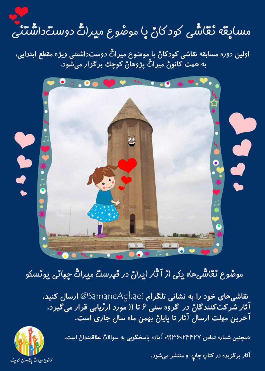 به گزارش گالري آنلاين به نقل از روابط عمومي کانون ميراث پژوهان کوچک، اولين دوره مسابقه نقاشي کودکان با موضوع «ميراث دوستداشتني» ويژه مقطع ابتدايي، به همت «کانون ميراث پژوهان کوچک» برگزار ميشود.