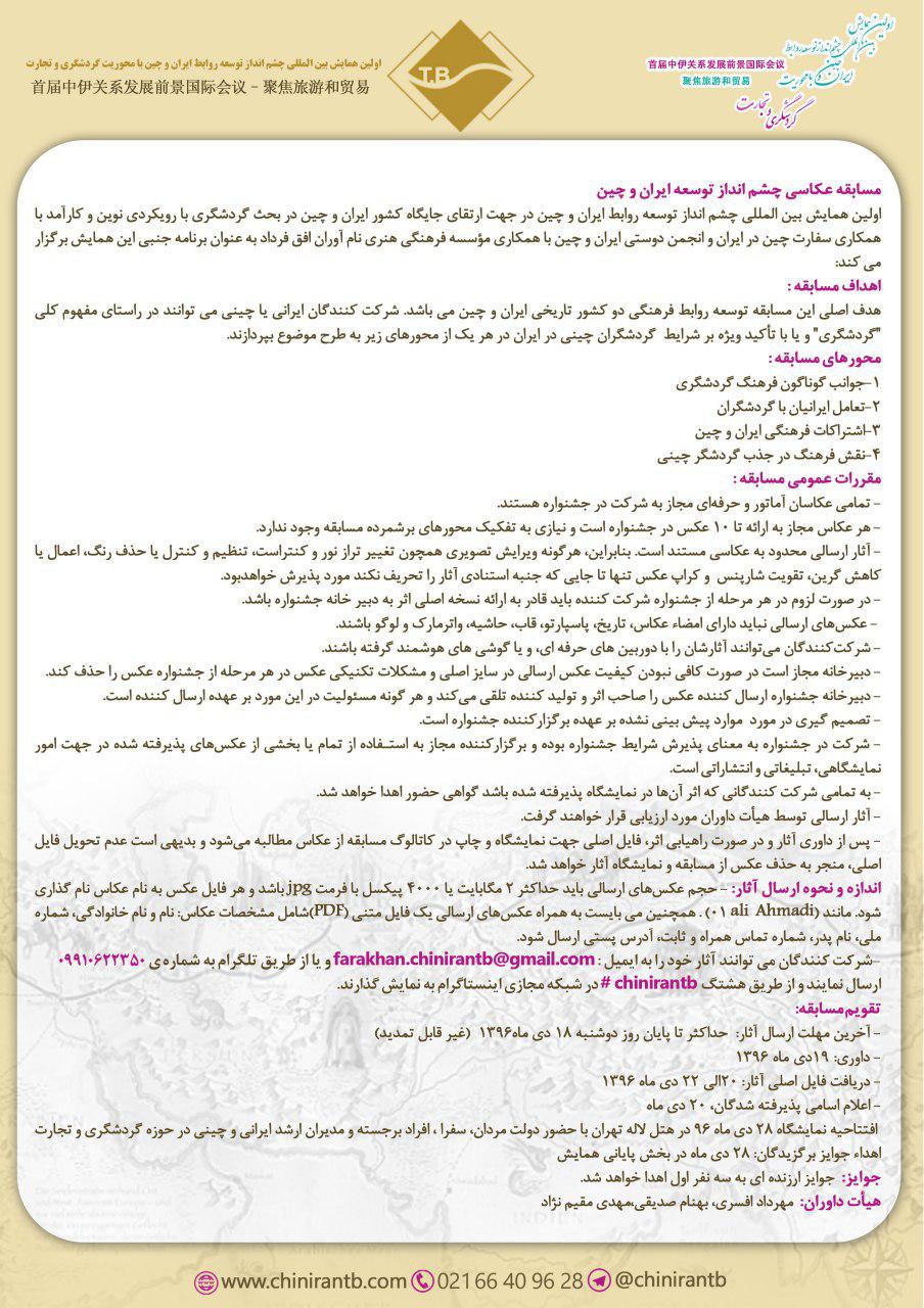 -شرکت کنندگان مي توانند آثار خود را به ايميل : farakhan.chinirantb@gmail.com و يا از طريق تلگرام به شماره ي 09910622350 ارسال نمايند و از طريق هشتگ chinirantb # در شبکه مجازي اينستاگرام به نمايش گذارند.