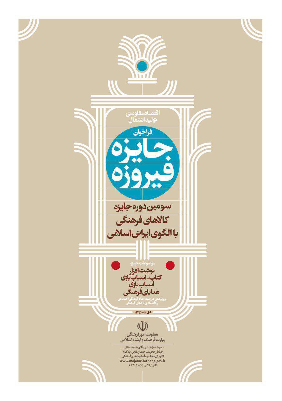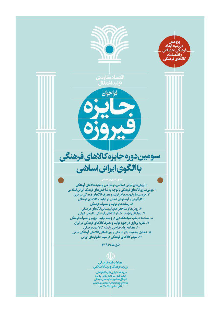 به گزارش گالري آنلاين به نقل از روابط عمومي انجمن تصويرگران ايران، علي فريدوني گفت در راستاي سياست هاي کلان وزارت فرهنگ و ارشاد اسلامي در حوزه اقتصاد مقاومتي و نيز تحقق منويات مقام معظم رهبري مبني بر ضرورت حمايت از توليد داخلي، معاونت امور فرهنگي در نظر دارد سومين دوره جايزه فيروزه را در دي ماه سال جاري برگزار کند.