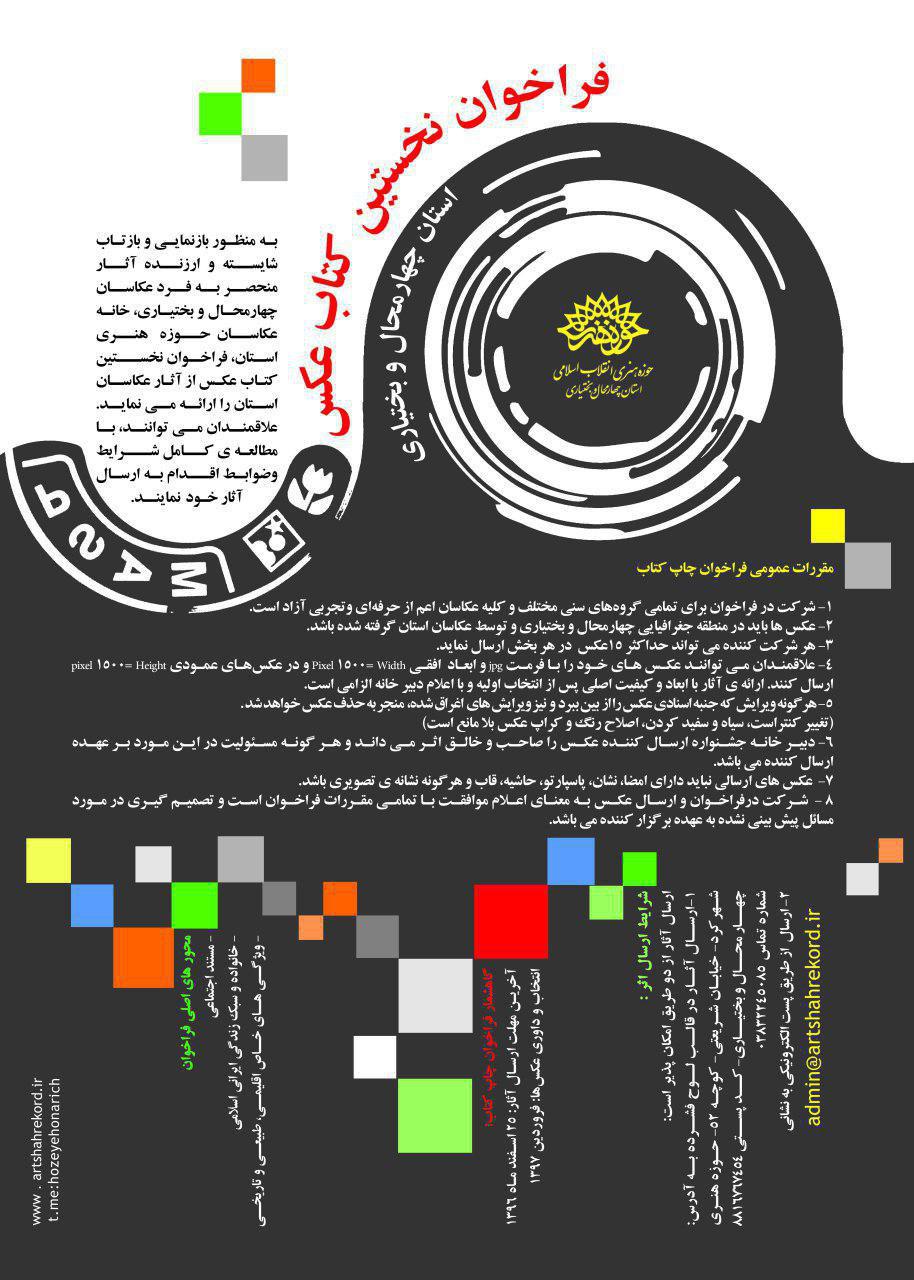 فراخوان کتاب عکس به منظور بازنمايي و بازتاب شايسته آثار منحصربهفرد عکاسان چهارمحال و بختياري و براي ثبت اين آثار طراحي و منتشر شده است.