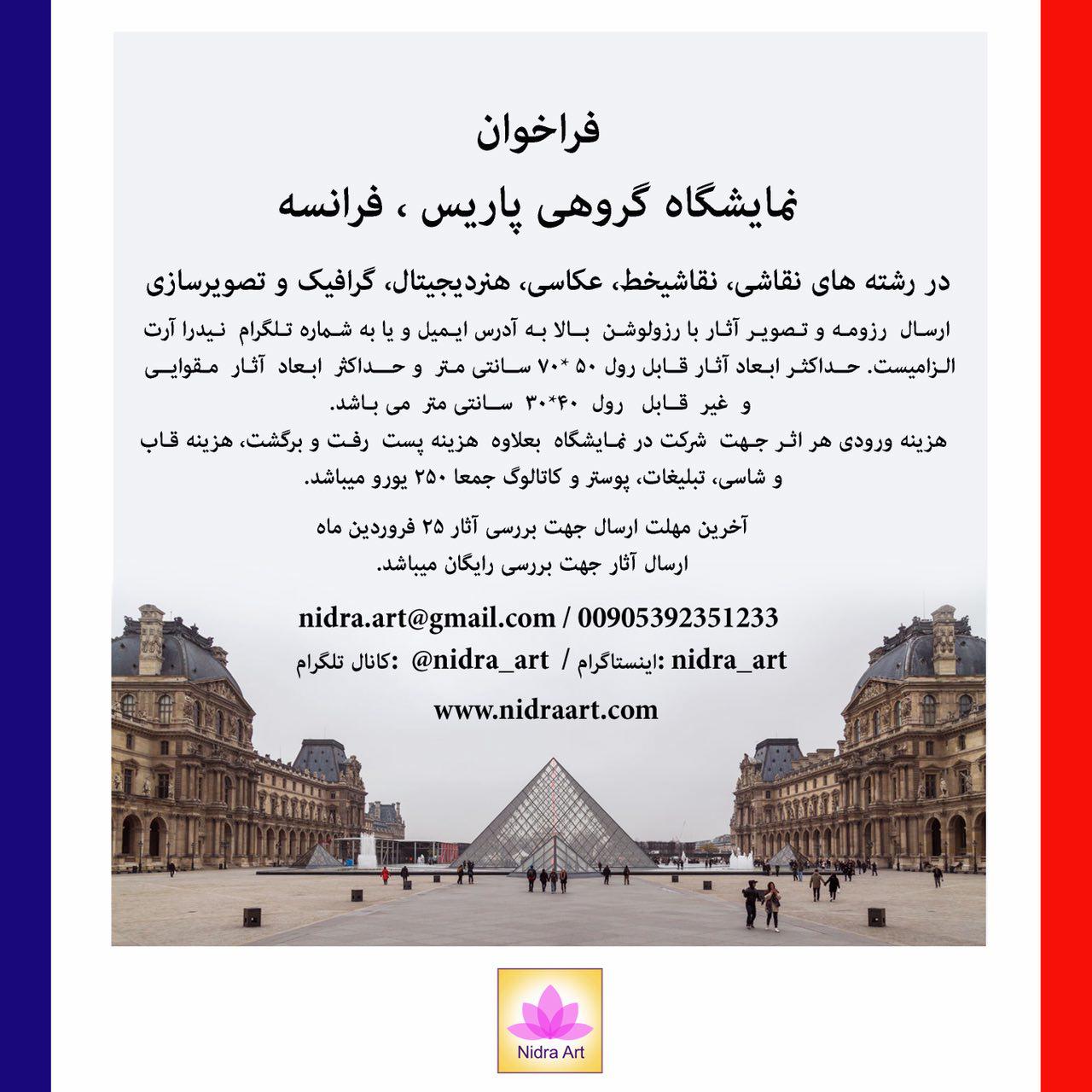 گروه هنري نيدراآرت در ادامه سلسله نمايشگاههاي بين المللي خود براي سومين بار اقدام به برگزاري نمايشگاه گروهي پاريس مي نمايد که در تاريخ ۳ خرداد ماه ۱۳۹۷ بمدت يک هفته در گالري ليندا فارل شهر پاريس فرانسه برگزار خواهد شد.