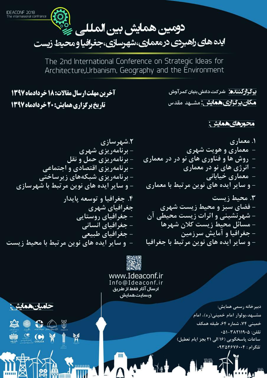 دومين دوره اين کنفرانس را با توجه به اهميت 4 موضوع اختصاصي علوم مهندسي مهم و مورد نياز کشور (معماري،شهرسازي،جغرافيا و محيط زيست) را با همکاري و حمايت دانشگاهها و نهادهاي علمي معتبر را با استعانت از خداوند متعال آغاز مي نمائيم. در اين دوره از همايش مقالات مرتبط با مشکلات و معضلات کنوني کشور بيشتر مد نظر است، لذا همانند دوره گذشته به 3 مقاله برتر پذيرفته شده ،علاوه بر درج در نشريات مهم علمي داخلي يا خارجي جوايز ارزشمندي اعطا خواهد شد. براي راهنمايي در خصوص چگونگي ارسال مقالات به دبيرخانه رسمي همايش بر روي اينجا کليک کنيد.