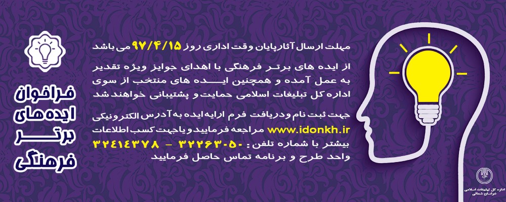 مديرکل تبليغات اسلامي استان تصريح کرد: جهت دريافت فرم ثبت نام و کسب اطلاعات بيشتر به درگاه الکترونيکي www.idonkh.ir مراجعه و يا با شماره تلفن ۳۲۴۱۴۳۷۸ – ۳۲۲۶۳۰۵۰ با پيش شماره ۰۵۸ واحد طرح وبرنامه تماس حاصل فرماييد.