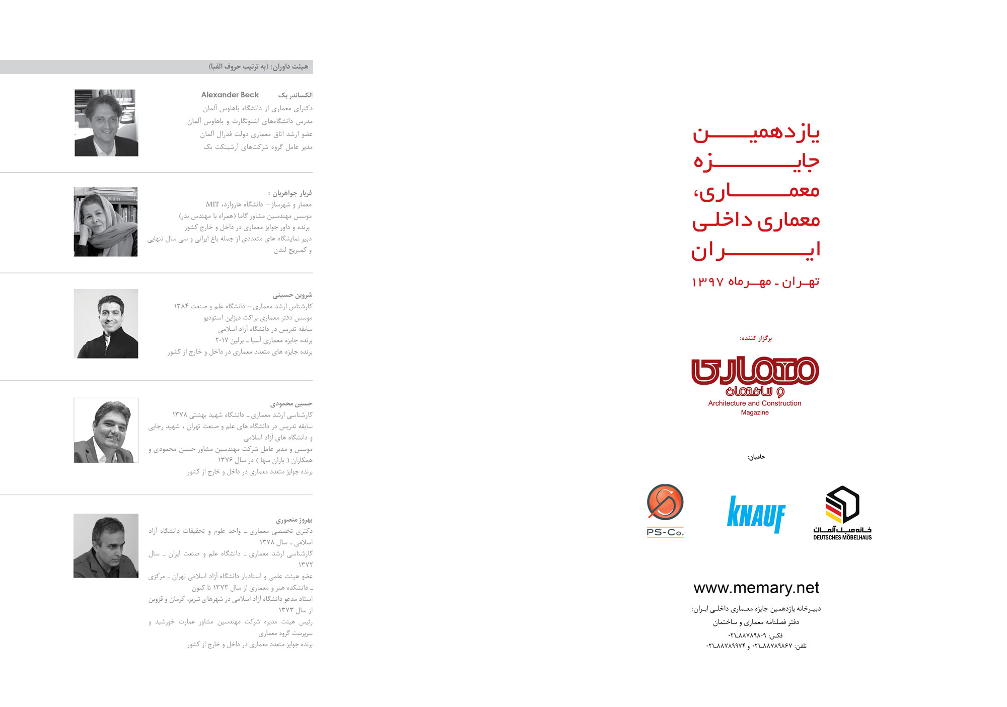 يازدهمين جايزه معماري ـ معماري داخلي ايران باابعاد گسترده و دعوت از شرکتکنندگان پروژههاي اجرا شده در داخل کشور توسط فصلنامهمعماري و ساختمان برگزار ميگردد.
