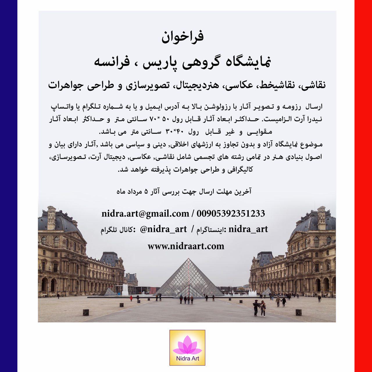 گروه ھنري نيدرا آرت در ادامه سلسله نمايشگاه ھاي بين المللي خود اقدام به برگزاري سي و ھفتمين نمايشگاه ھنرھاي تجسمي ھنرمندان ايراني در رشته هاي نقاشي، نقاشيخط، طراحي، عکاسي، ديجيتال آرت و طراحي زيورآلات مي نمايد که در ۵ مھر ماه ١٣٩٧ بمدت يک ھفته در گالري ليندا فارل شھر پاريس برگزار خواھد شد.