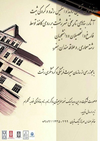 فراخوان نخستين رويداد اسکيس راندو و کروکي ثبت آثار، بناهاي تاريخي شهر رشت بر روي کاغذ توسط فارغ التحصيلان و دانشجويان معماري و علاقه مندان به هنر برگزار مي گردد.