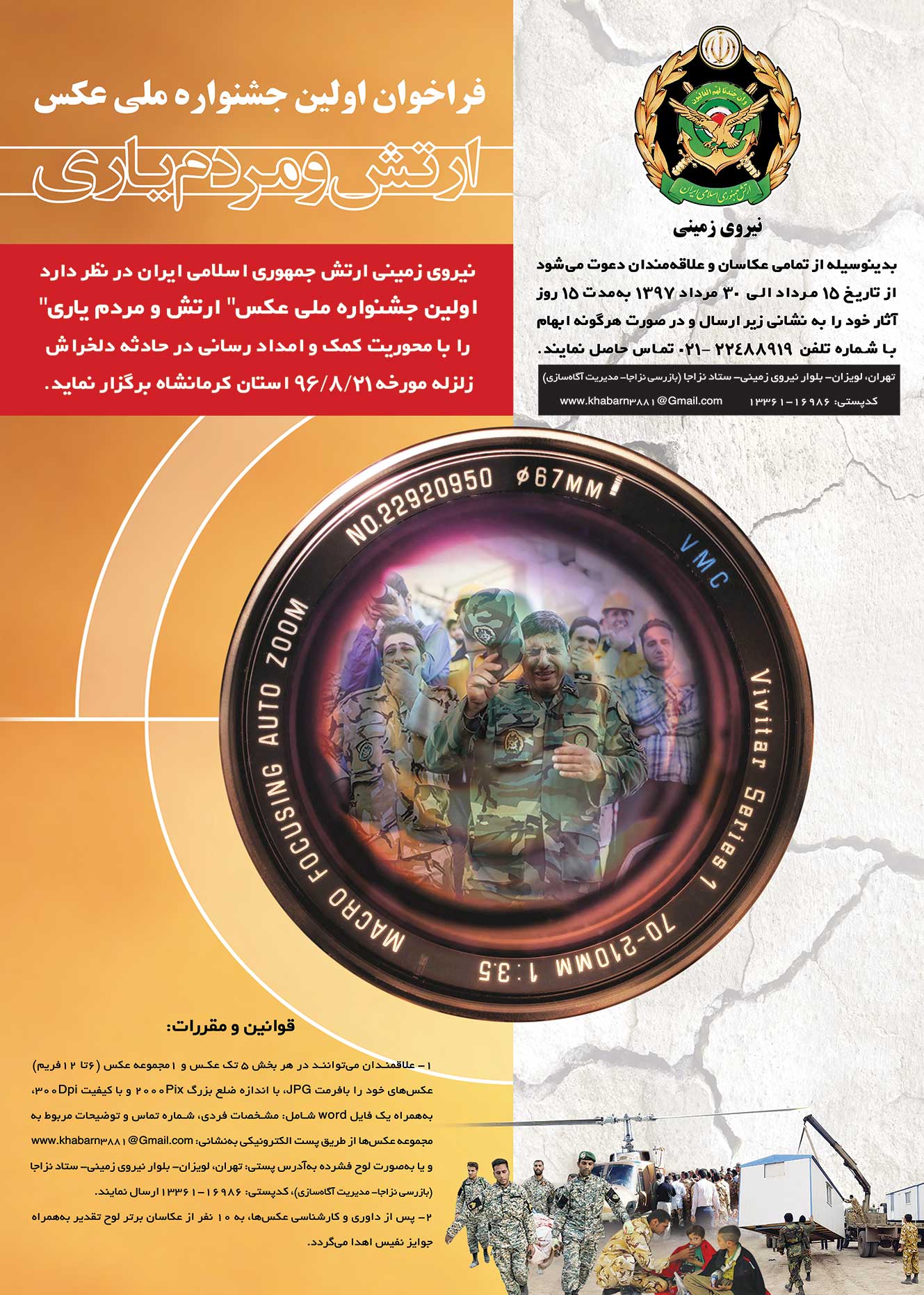 نيروي زميني ارتش جمهوري اسلامي ايران در نظر دارد اولين جشنواره ملي عکس ارتش و مردمياري را با محوريت کمک و امدادرساني در حادثه دلخراش زلزله استان کرمانشاه برگزار نمايد.