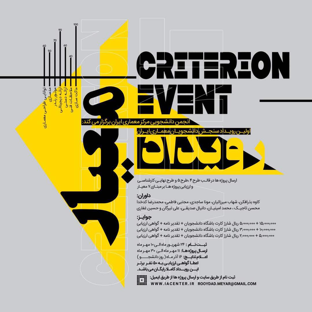 کليه فارغ التحصيلان و دانشجويان مقطع کارشناسي ناپيوسته و پيوسته رشته معماري مي توانند با ثبت نام در سايت مرکز معماري ايران و پر کردن پرسش نامه ،پروژه هاي خود را در قالب هاي تعريف شده جهت ارزيابي به ادرس ايميل Rooydad.meyar@gmail.com ارسال نمايند.