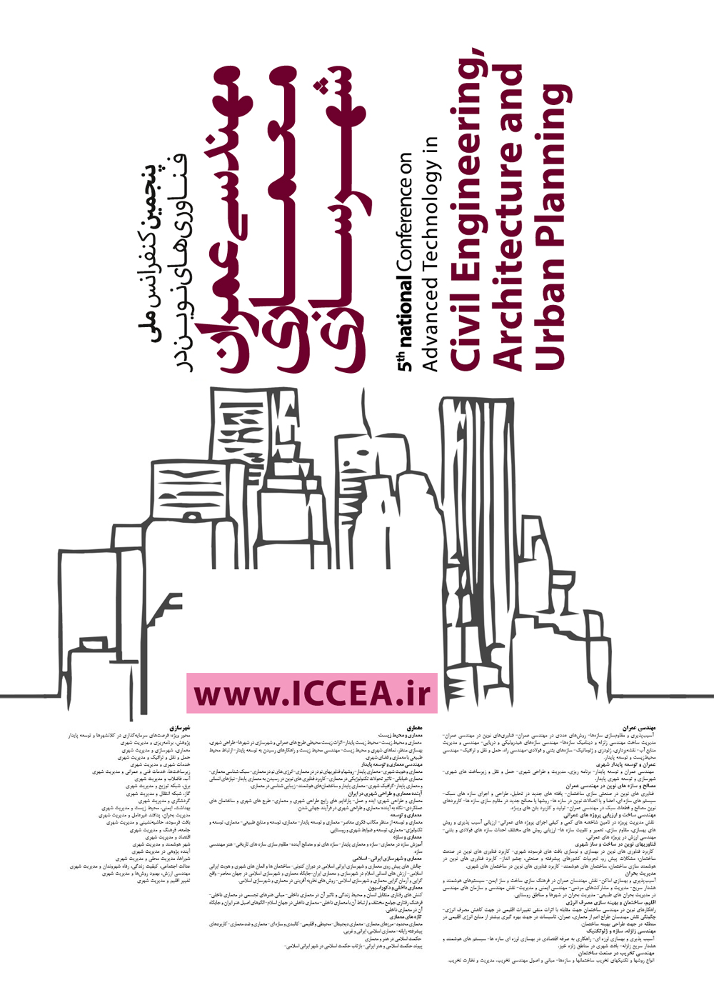 عمران و توسعه پايدار شهري: مهندسي عمران و توسعه پايدار- برنامه ريزي، مديريت و طراحي شهري- حمل و نقل و زيرساخت هاي شهري- شهرسازي و توسعه شهري پايدار.