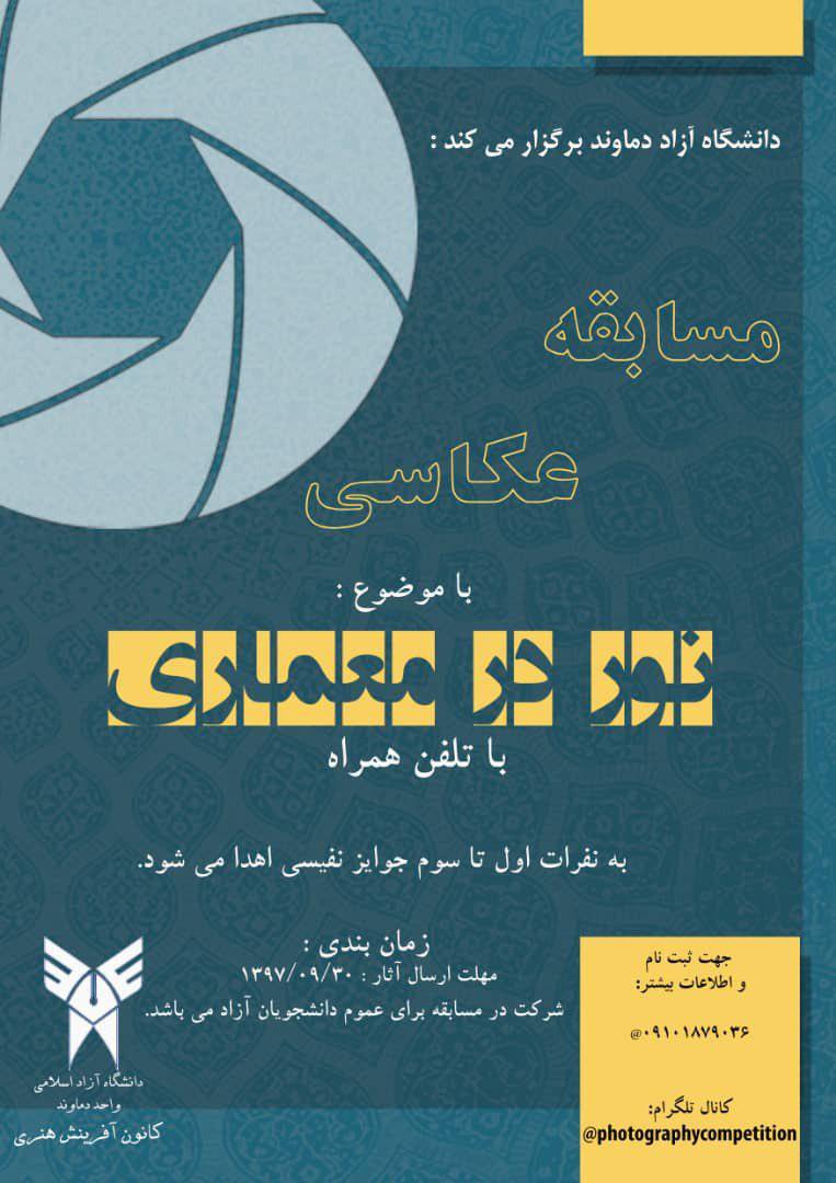دانشگاه آزاد اسلامي واحد دماوند از کليه دانشجويان علاقمند به هنر عکاسي جهت ارسال آثار خود تحت عنوان "نور در معماري" دعوت به عمل مي آورد.