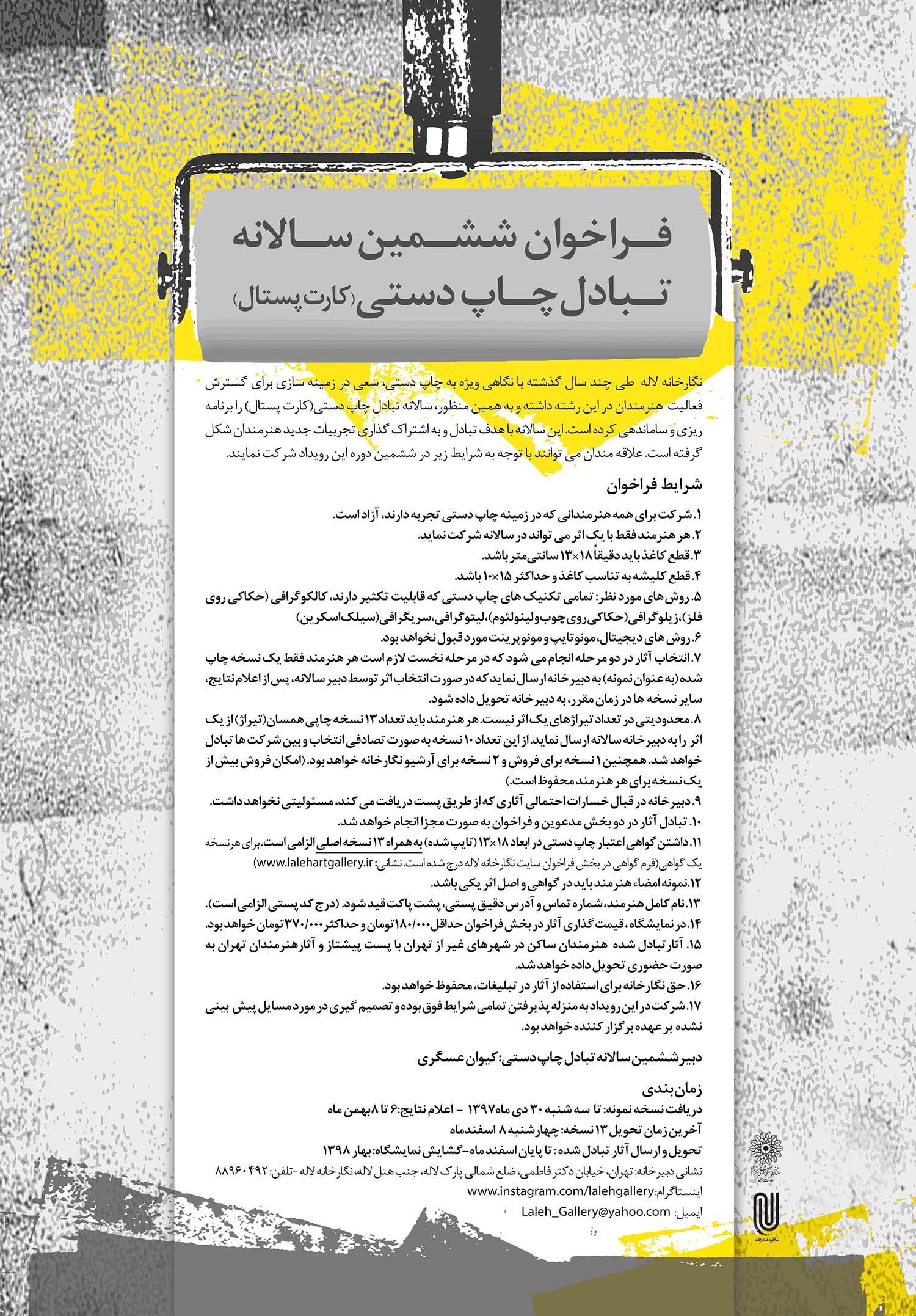 از کليه علاقه منداني که در زمينه چاپ دستي تجربه دارند دعوت مي شود با توجه به شرايط فراخوان در ششمين سالانه تبادل چاپ دستي(کارت پستال) شرکت نمايند.