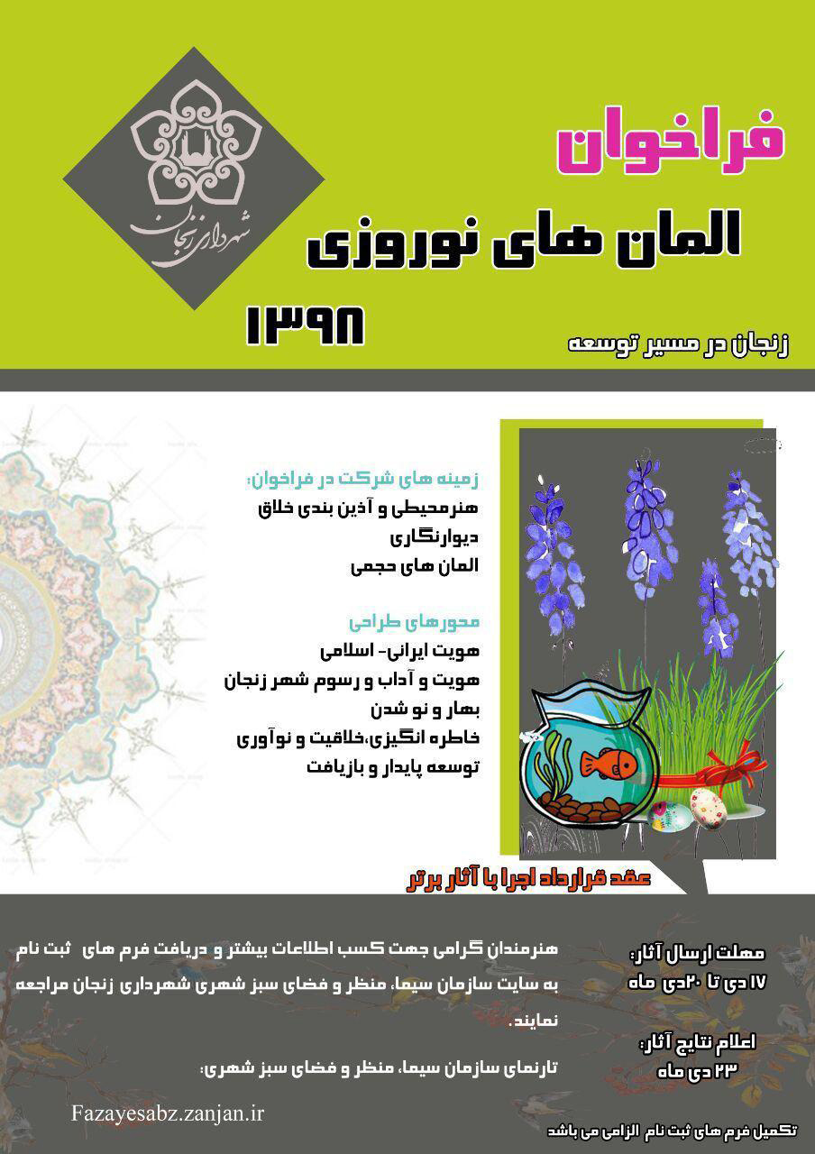 سازمان سيما، منظر و فضاي سبز شهري شهرداري زنجان در نظر دارد با استعانت از خداوند متعال در جهت نشاط بخشي به شهر در ايام نوروز نسبت به ساخت المانهاي نوروزي اقدام نمايد و در اين راستا از تمامي اساتيد، هنرمندان و شهروندان گرامي دعوت مي نمايد، ايدههاي خود را در ارتباط با موضوع بهار و عيد نوروز تا پايان وقت اداري مورخ 20/10/97 به نشاني دبيرخانه اين اداره ارسال نمايند.