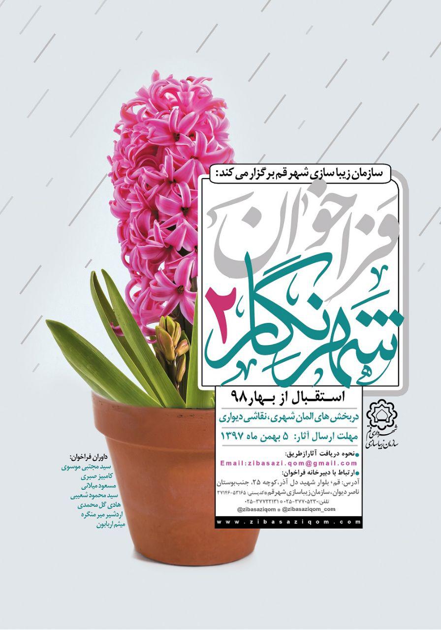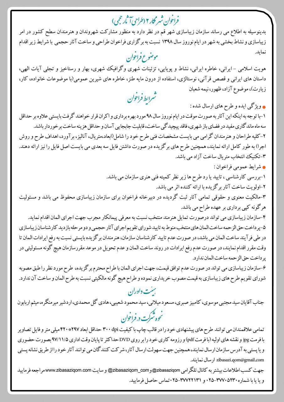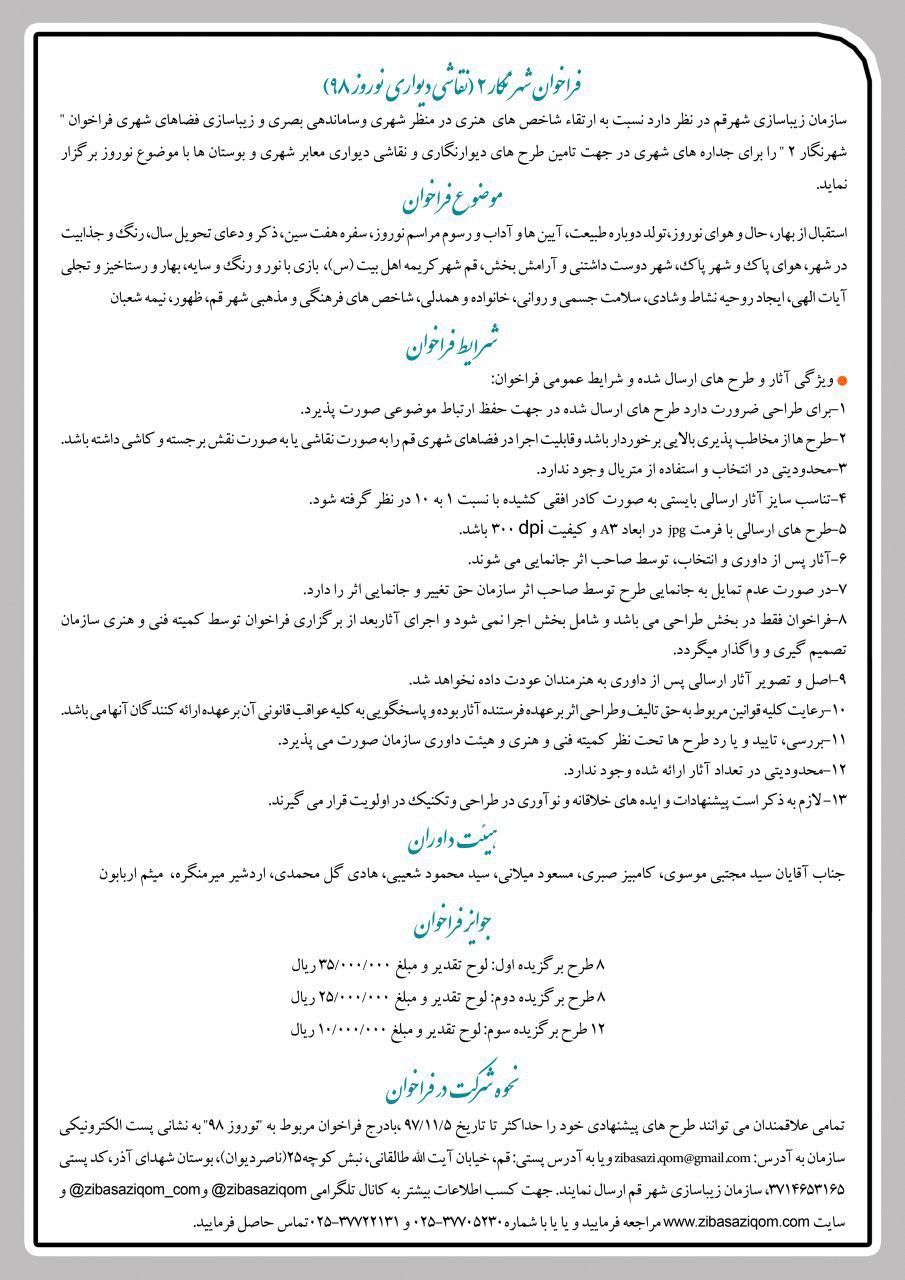 سازمان زيباسازي شهر قم در نظر دارد نسبت به ارتقا شاخص هاي هنري در منظر شهري و ساماندهي بصري و زيباسازي فضاهاي شهري فراخوان "شهرنگار2" را براي جداره هاي شهري در جهت تامين طرح هاي ديوارنگاري و نقاشي ديواري معابر شهري و بوستان ها با موضوع نوروز و طراحي و ساخت آثار حجمي در جهت زيباسازي و نشاط بخشي به شهر در ايام نوروز برگزار نمايد.