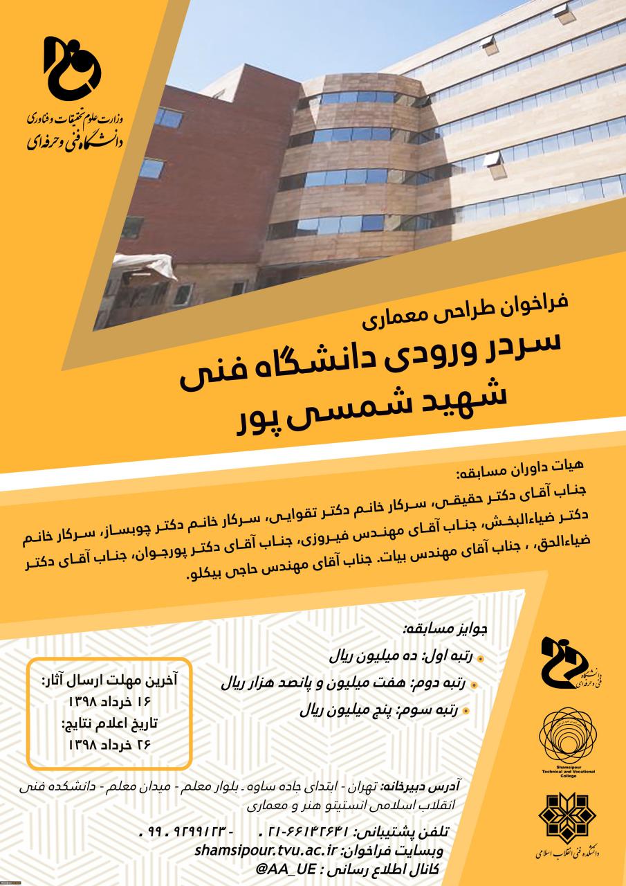 دانشگاه فني و حرفه اي در نظر دارد، سردر دانشکده فني شهيد شمسي پور تهران را از طريق برگزاري مسابقه طراحي و اجرا نمايد.