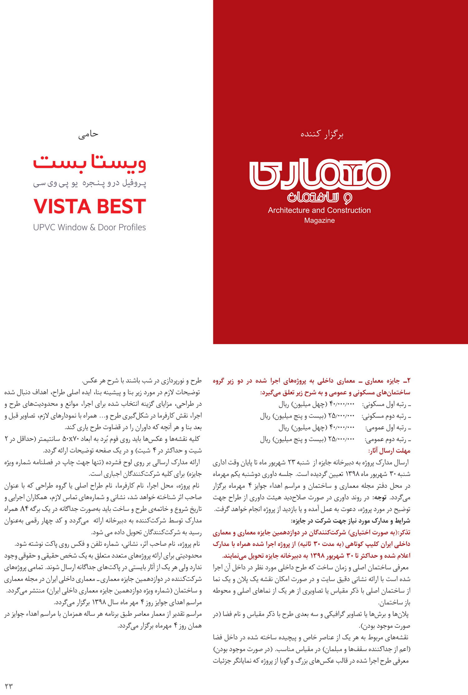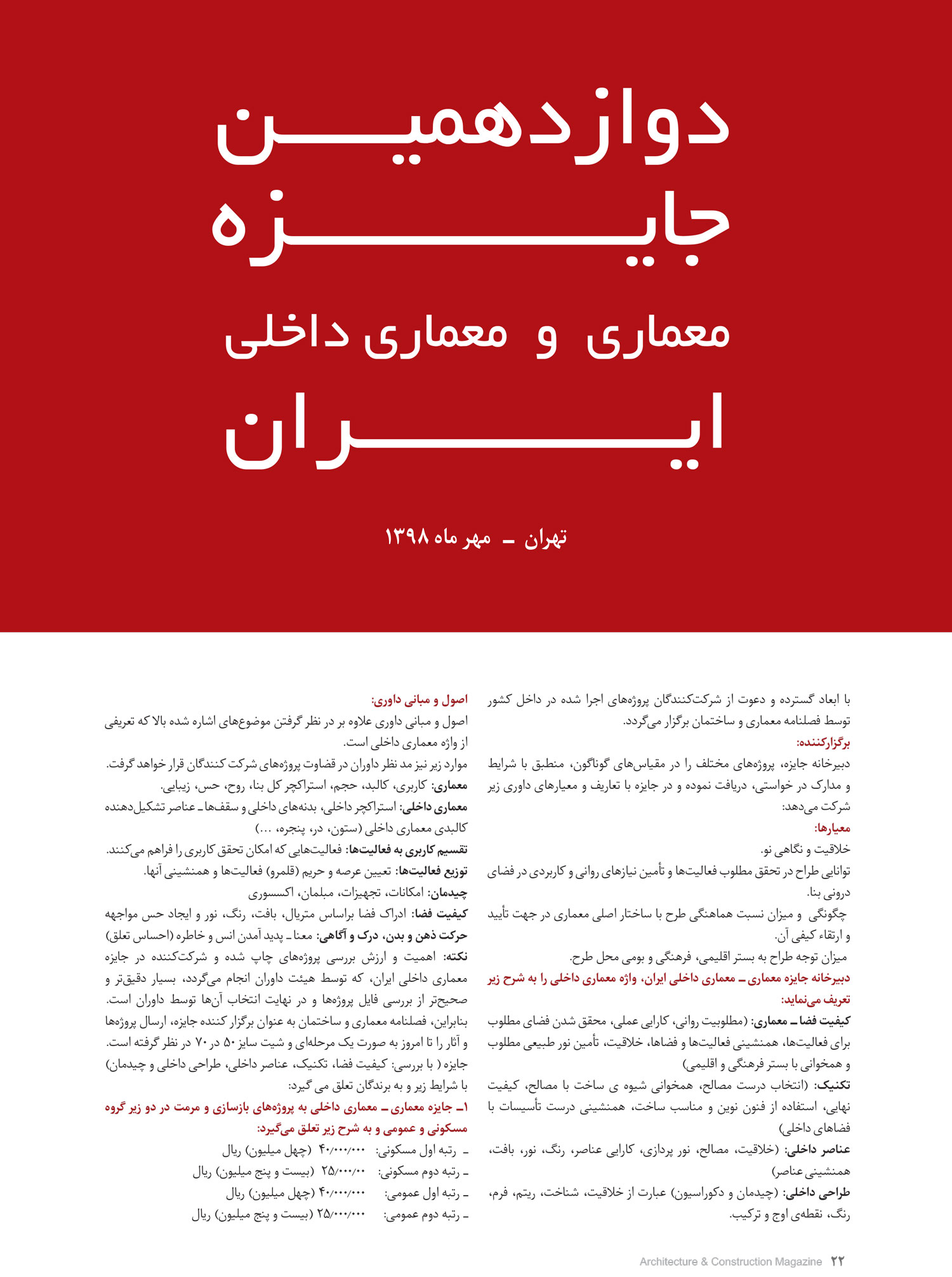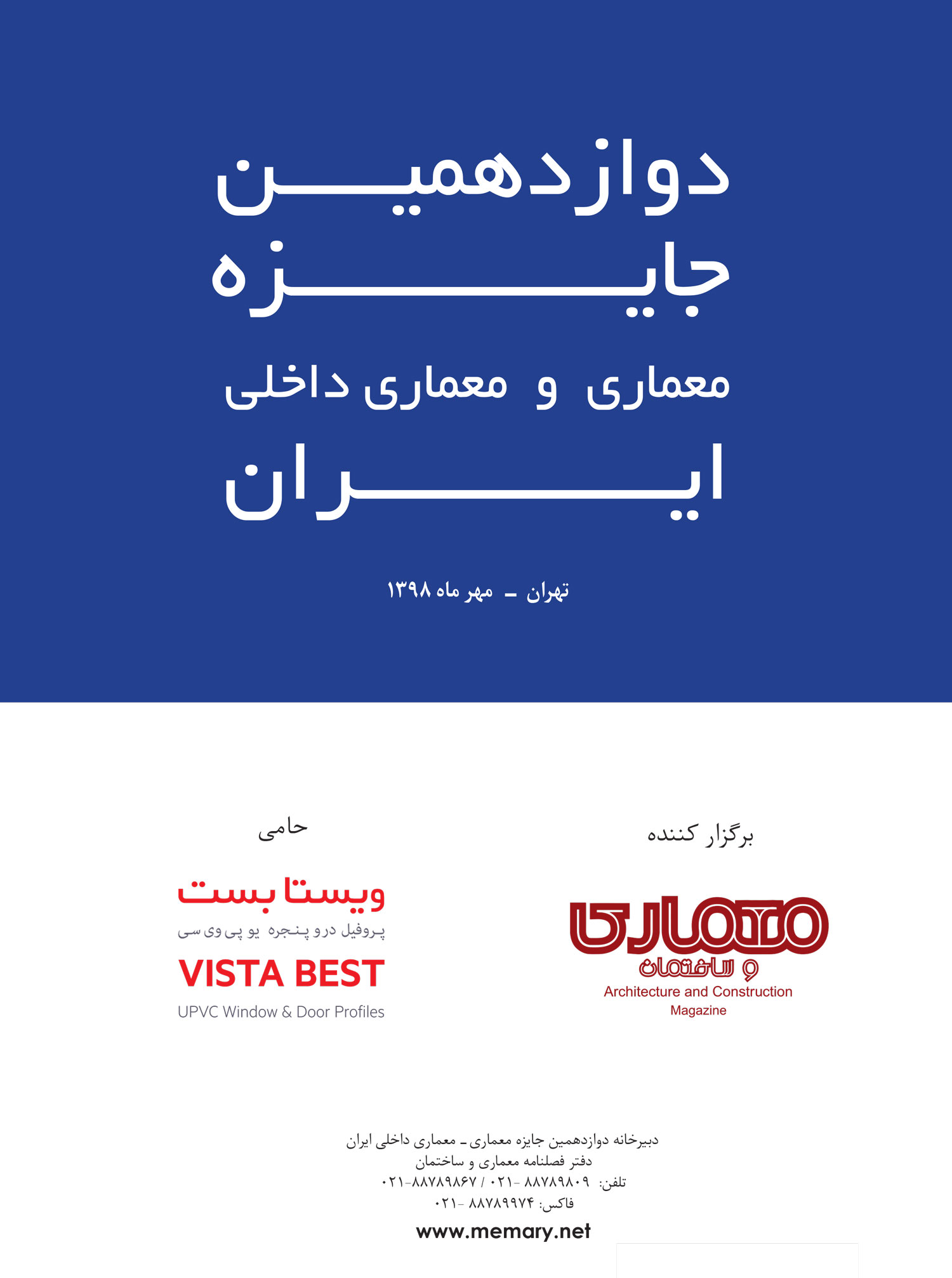 دوازدهمين جايزه معماري و معماري داخلي ايران مهرماه 1398 با ابعاد گسترده و دعوت از شرکت کنندگان پروژه هاي اجرا شده در داخل کشور توسط فصلنامه معماري وساختمان برگزار مي گردد.