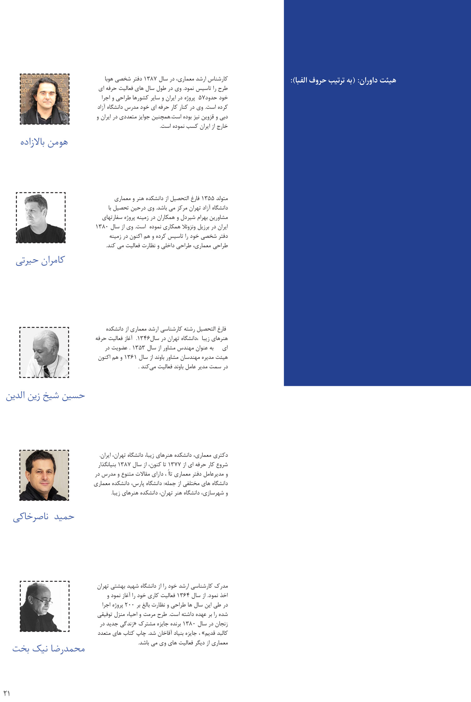• 2- جايزه معماري – معماري داخلي به پروژه هاي اجرا شده در دو زير گروه ساختمان هاي مسکوني و عمومي به شرح زير تعلق مي گيرد: