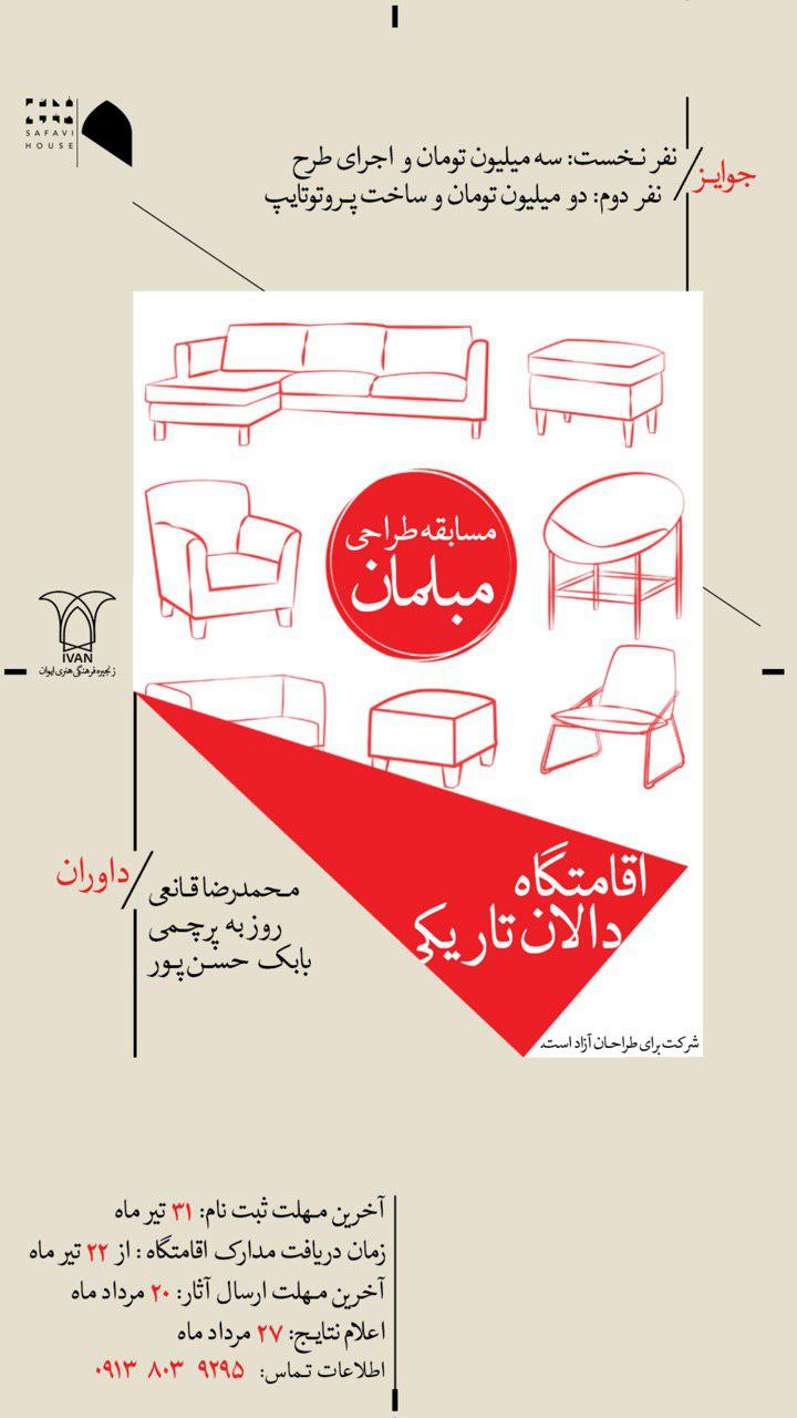 به گزارش گالري آنلاين به نقل از روابط عمومي زنجيره فرهنگي ايوان، اين بنا در آينده اي نزديک به اقامتگاهي جهت اقامت و پذيرايي گردشگران جوان و فرهيخته تبديل خواهد شد. از اين رو، براي دستيابي به طرحي درخشان، جهت مبلمان داخلي اين فضا، مسابقه اي به شرح زير پيش بيني شده است: