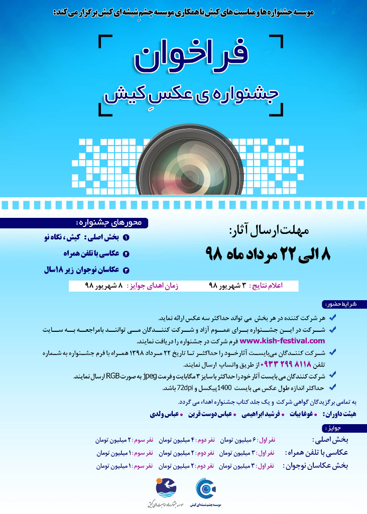 موسسه جشنواره ها و مناسبت هاي کيش با همکاري موسسه چشم شيشه اي کيش، "جشنواره عکس کيش" را برگزار ميکنند.