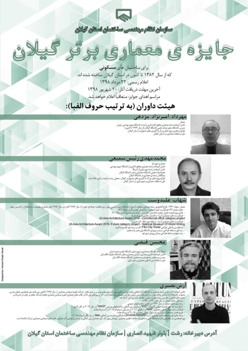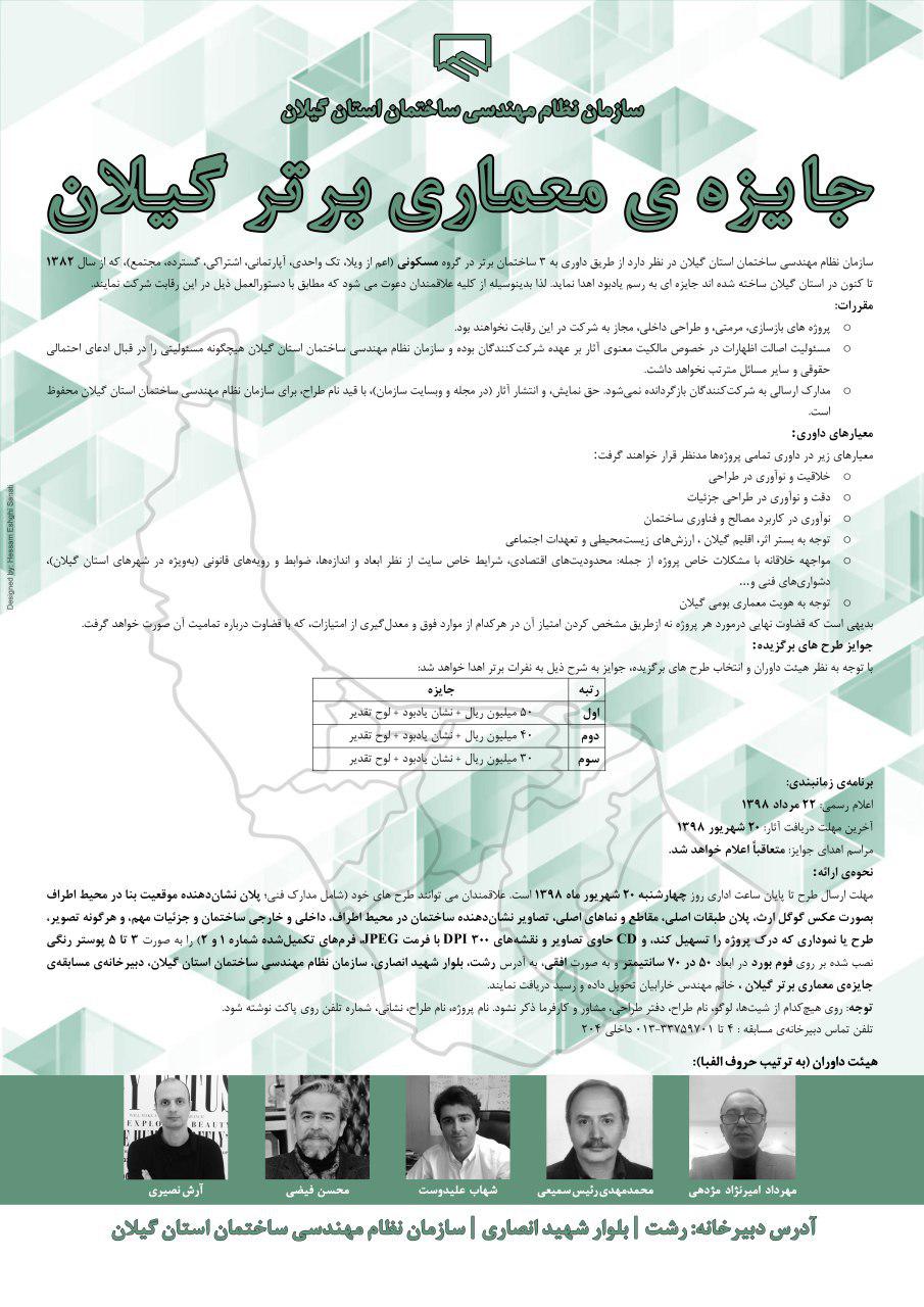 سازمان نظام مهندسي ساختمان استان گيلان در نظر دارد از طريق داوري به 3 ساختمان برتر در گروه مسکوني (اعم از ويلا، تک واحدي، آپارتماني، اشتراکي، گسترده، مجتمع)، که از سال 1382 تا کنون در استان گيلان ساخته شده اند جايزه اي به رسم يادبود اهدا نمايد. لذا بدينوسيله از کليه علاقمندان دعوت مي شود که مطابق با دستورالعمل ذيل در اين رقابت شرکت نمايند.