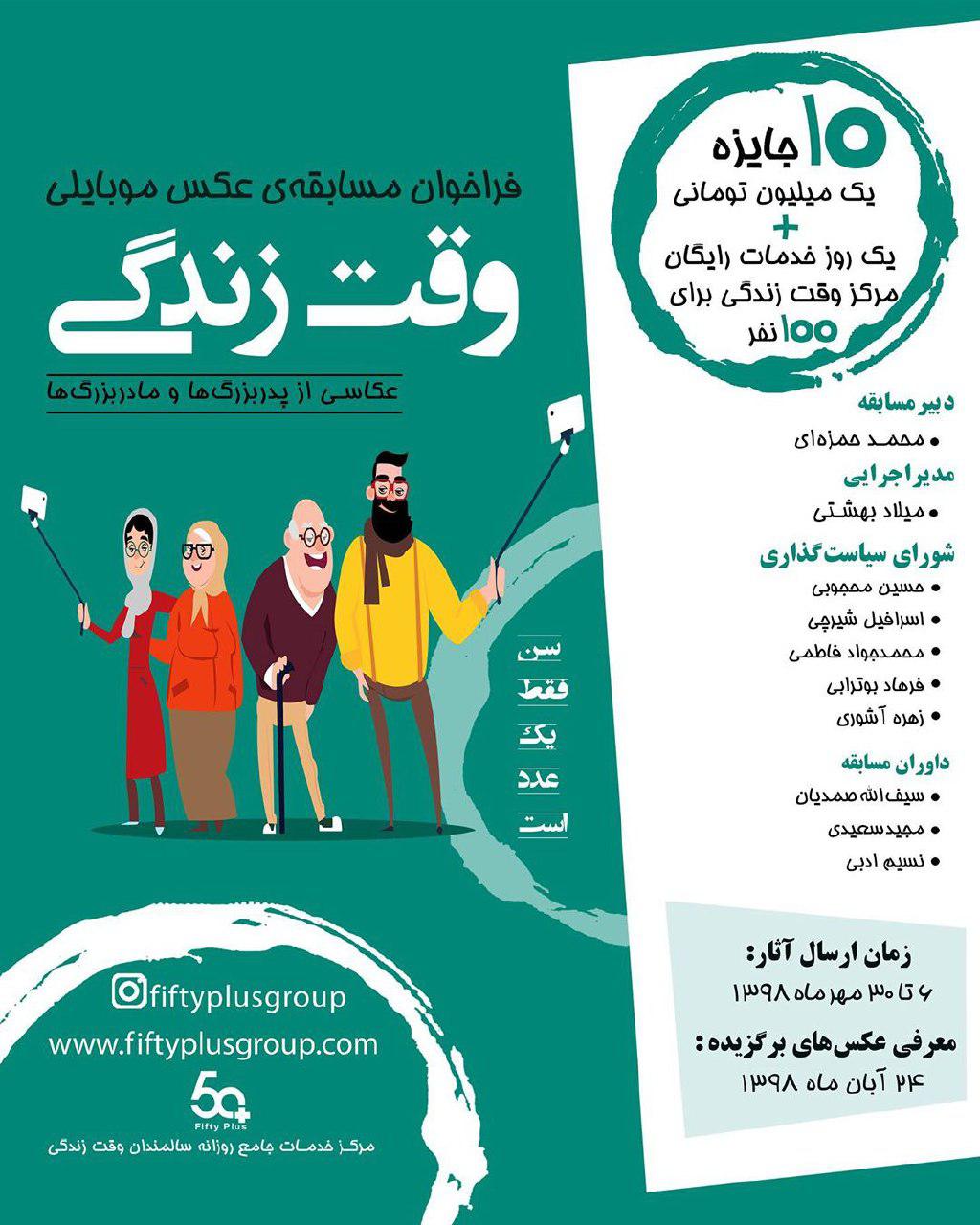 مرکز خدمات جامع روزانه سالمندان وقت زندگي به مناسبت روز جهاني سالمندان و با هدف اهميت بخشيدن به جايگاه ارزشمند بزرگترهاي خانواده، مسابقهي عکسي با موضوع شور و نشاط زندگي و محوريت عکاسي از پدربزرگها و مادربزرگها (يا پدرها و مادرها) برگزار مينمايد.