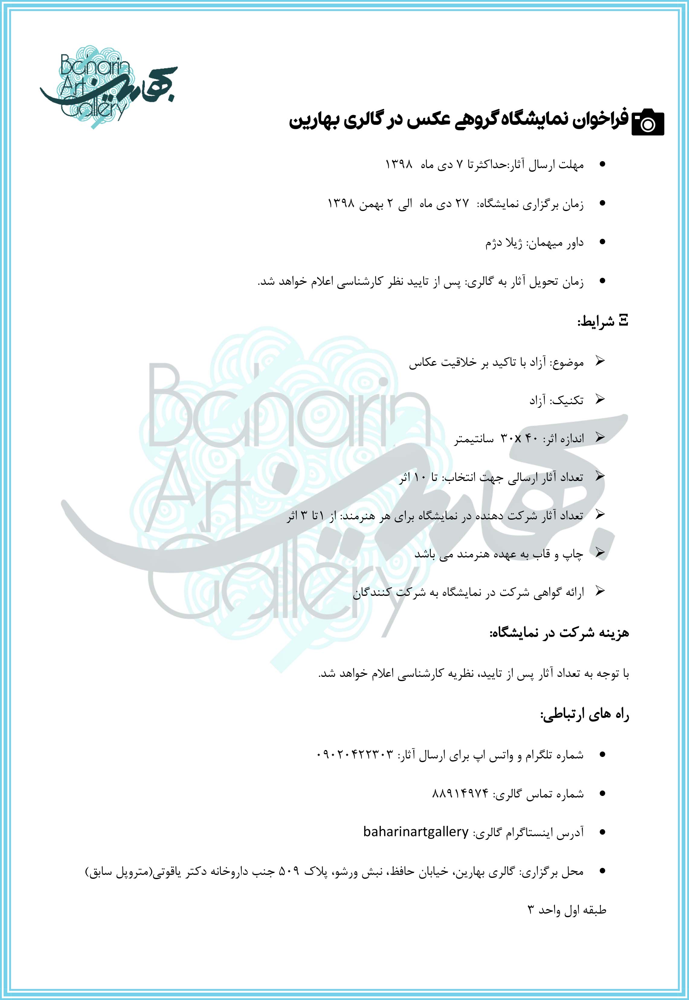 محل برگزاري: گالري بهارين، خيابان حافظ، نبش ورشو، پلاک 509، جنب داروخانه دکتر ياقوتي (متروپل سابق)، طبقه اول واحد 3