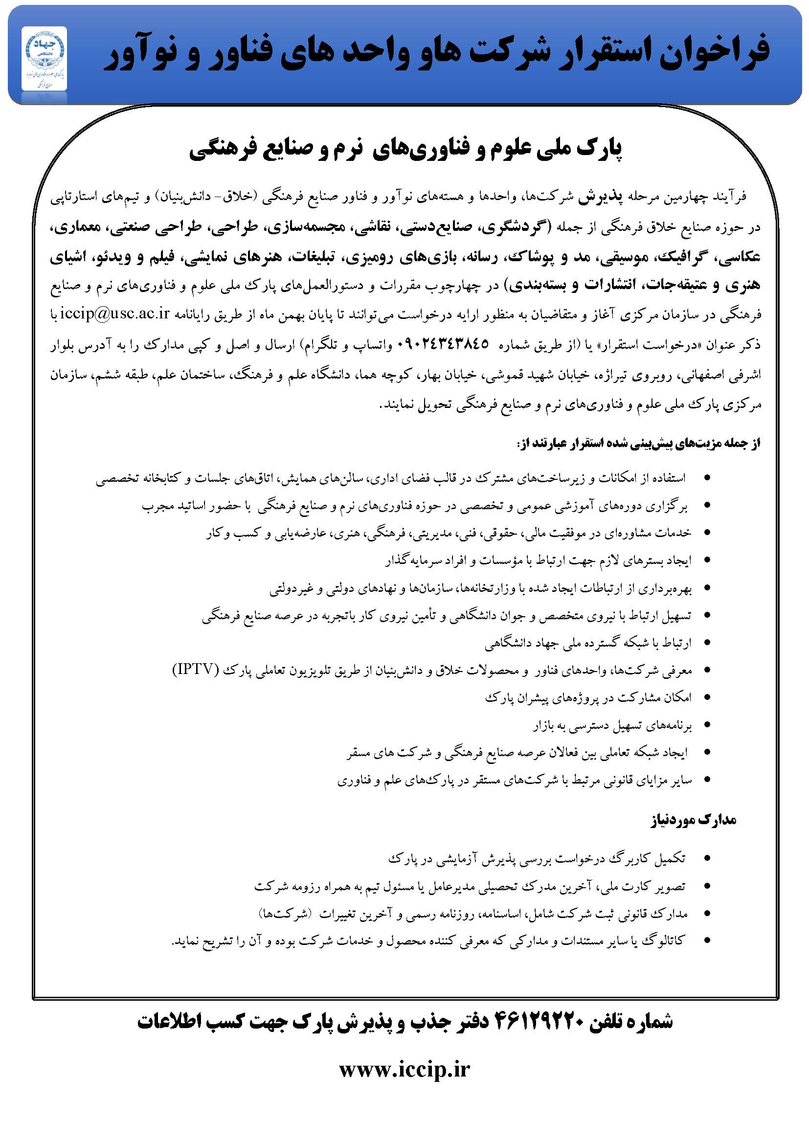 فرايند چهارمين مرحله پذيرش شرکت ها، واحدها و هسته هاي نوآور و فناور صنايع فرهنگي (خلاق-دانش بنيان) و تيم هاي استارتاپي در حوزه صنايع خلاق فرهنگي از جمله (گردشگري، صنايع دستي، نقاشي، مجسمه سازي، طراحي صنعتي، معماري، عکاسي، گرافيک، موسيقي، مد و پوشاک، رسانه، بازي هاي روميزي، تبليغات، هنرهاي نمايشي، فيلم و ويدئو، اشياي هنري عتيقه جات، انتشارات و بسته بندي) در چهارچوب مقررات و دستورالعمل هاي پارک ملي علوم و فناوري هاي نرم و صنايع فرهنگي در سازمان مرکزي آغاز شده است.