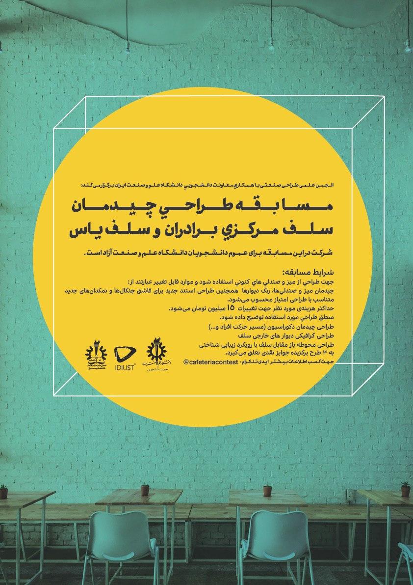 معاونت دانشجويي با همکاري انجمن علمي طراحي صنعتي دانشگاه علم و صنعت ايران مسابقه طراحي چيدمان سلف مرکزي برادران و سلف ياس را برگزار ميکنند.