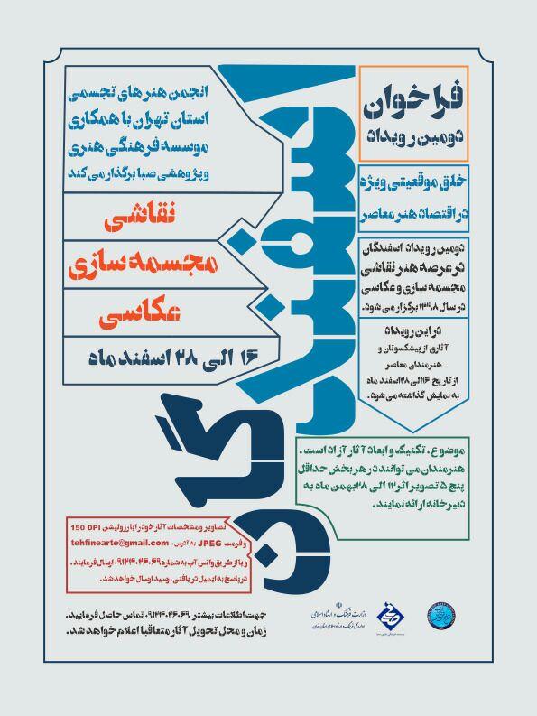 دومين رويداد فرهنگي هنري اسفندگان در عرصه هنرهاي نقاشي، مجسمه سازي و عکاسي از پانزدهم لغايت بيست و پنجم اسفندماه با همکاري موسسه فرهنگي هنري، پژوهشي صبا، در گالري خيال و آينه برگزار خواهد شد.