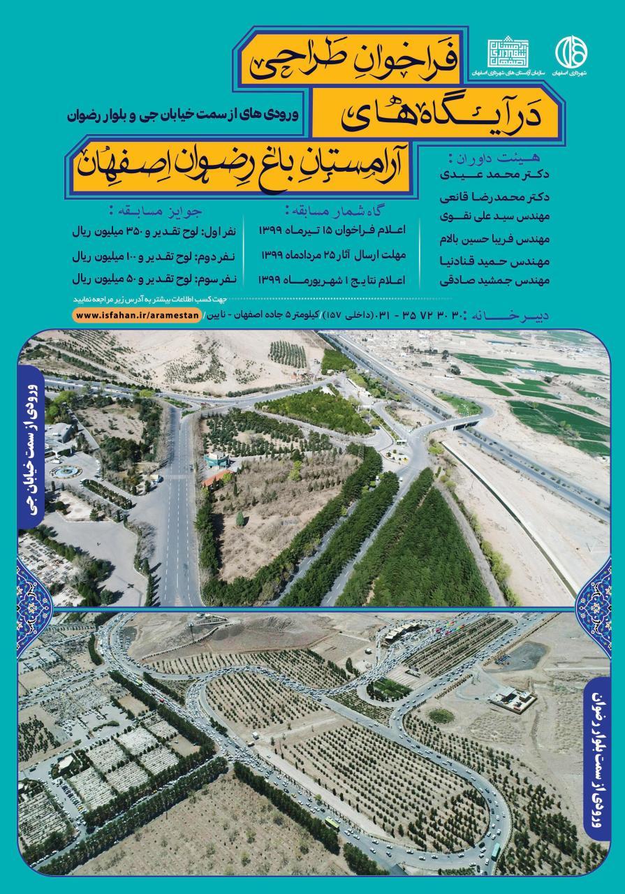 سازمان آرامستان هاي شهرداري اصفهان در نظر دارد به منظور ارتقاي کيفي سيما و منظر ورودي ها، نسبت به طراحي درآيگاه ورودي ها، با در نظر گرفتن فعاليت و اهداف سازمان اقدام نمايد؛ لذا در راستاي ايجاد رقابت سالم از تمامي علاقمندان به طراحي، معماري، مجسمه سازي و …. به صورت فردي يا گروهي دعوت مي گردد نسبت به ثبت نام در مسابقه اقدام نموده و طرح هاي پيشنهادي خود را مطابق شرايط ذکر شده به دبيرخانه مسابقه ارسال نمايند. اين مسابقه در سطح ملي و در دو مرحله برگزار مي گردد.