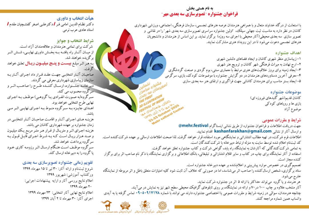 با استعانت از درگاه خداوند متعال و با همراهي هنرمندان عرصه هنرهاي تجسمي، سازمان فرهنگي، اجتماعي، ورزشي شهرداري کاشان در نظر دارد به مناسبت ثبت جهاني سيلک، "اولين جشنواره سراسري تصويرسازي سه بعدي شهر" را در نقاشي و تصوير سازي سه بعدي محيطي(آثار محيطي با اجراي سه روزه) برگزار نمايد. بر اين اساس از هنرمندان و دانشجويان هنرهاي تجسمي دعوت ميشود تا در اين رويداد هنري مشاركت نمايند.