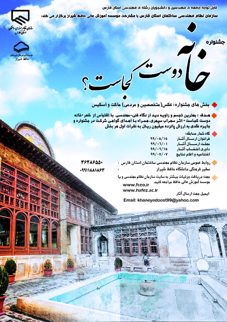 آدرس: شيراز، بلوار ستارخان، انتهاي 12 متري نمازي، سر نبش، سازمان نظام مهندسي ساختمان استان فارس تلفن 071-36486550