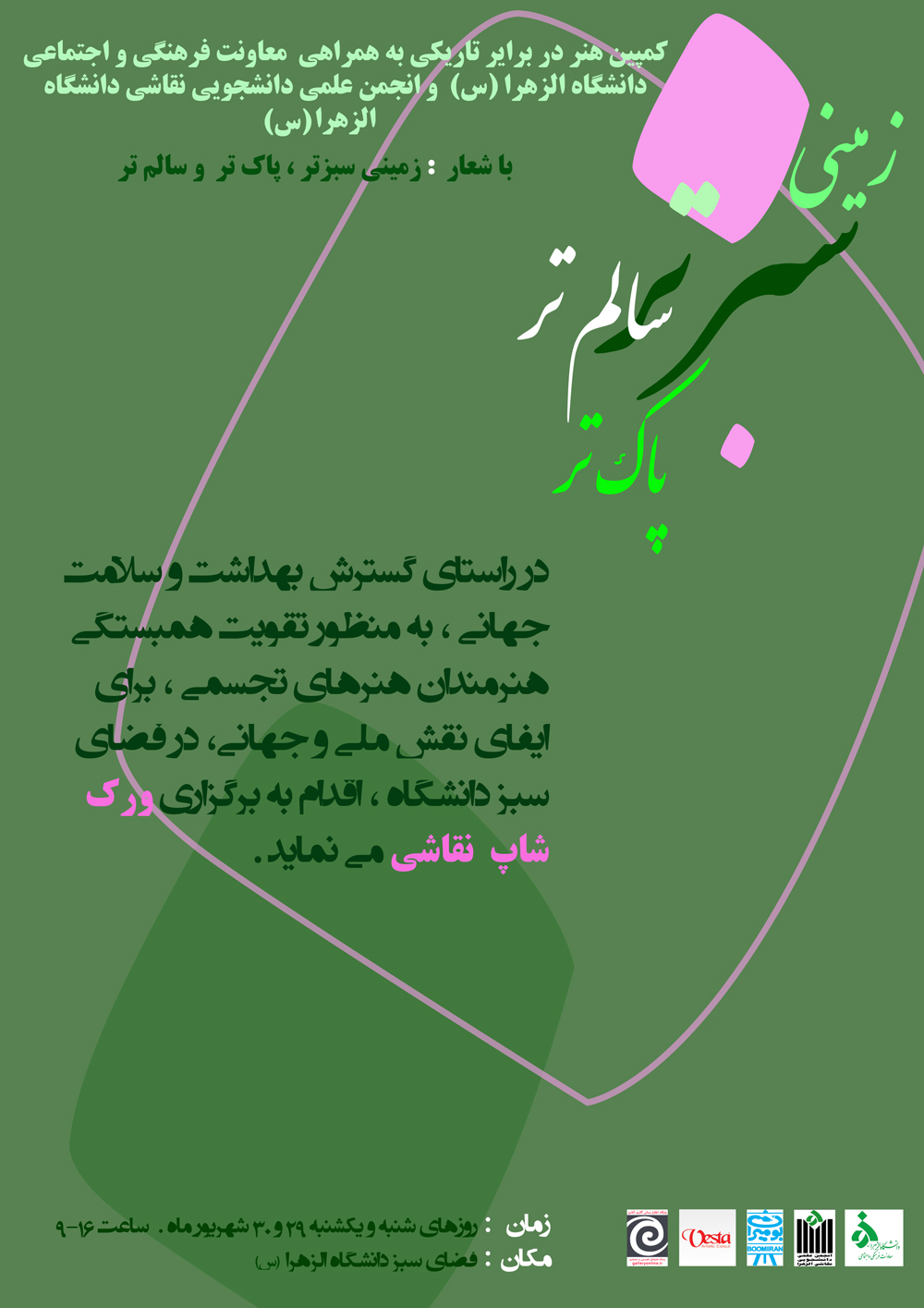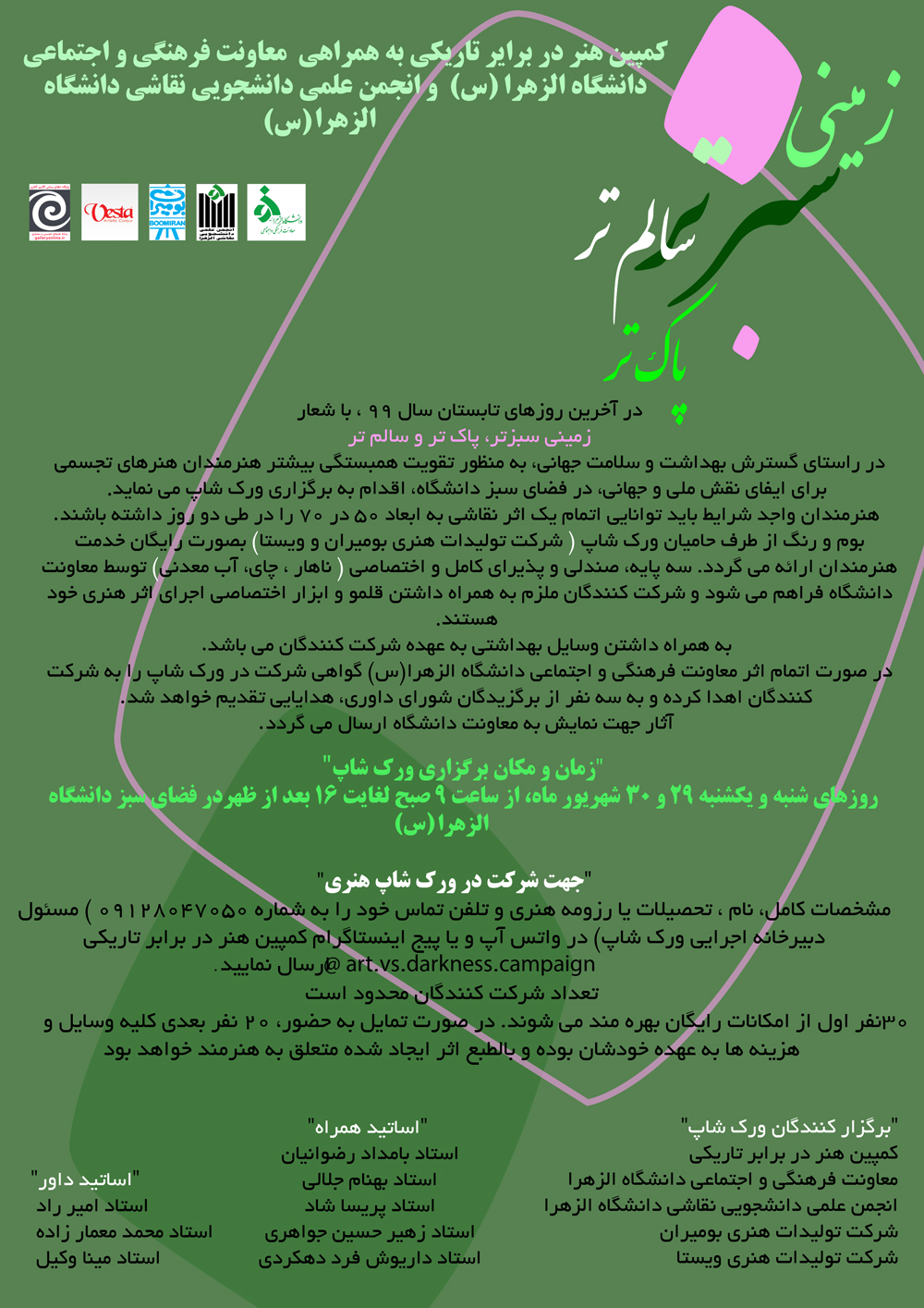 كمپين هنر در برابر تاريكي به همراهي معاونت فرهنگي و اجتماعي دانشگاه الزهرا (س) و انجمن علمي دانشجويي نقاشي دانشگاه الزهرا (س) در آخرين روزهاي تابستان سال ٩٩، با شعار: زميني سبزتر، پاك تر و سالم تر در راستاي گسترش بهداشت و سلامت جهاني، به منظور تقويت همبستگي بيشتر هنرمندان هنرهاي تجسمي، براي ايفاي نقش ملي و جهاني، در فضاي سبز دانشگاه، اقدام به برگزاري ورك شاپ مي نمايد.