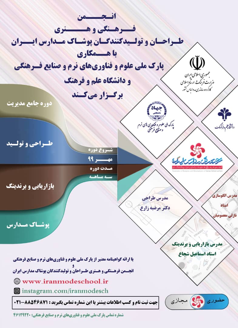 "انجمن فرهنگي و هنري طراحان و توليدکنندگان پوشاک مدارس ايران" با همکاري "پارک ملي علوم و فناوريهاي نرم و صنايع فرهنگي" در راستاي نيل به اهداف ترسيم شده در ماده 9 اساسنامه انجمن و همچنين تحقق اهداف قانون ساماندهي مد و لباس کشور مصوب مجلس شوراي اسلامي، به منظور ارتقاء سطح کيفي دانش فني اهالي مرتبط با حوزه پوشاک مدارس کشور در تمامي بخشها و با هدف حمايت از توليد ملي در سال جهش توليد، نخستين دوره آموزشي مديريت طراحي، توليد، بازاريابي و برندينگ پوشاک مدارس را در مجموعه پارک ملي علوم و فناوريهاي نرم و صنايع فرهنگي دانشگاه علم و فرهنگ برگزار ميکند.