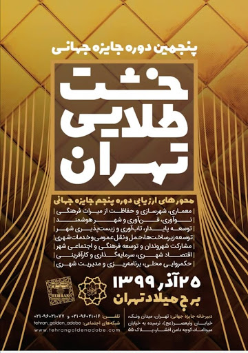 پنجمين دوره جايزه جهاني خشت طلايي تهران، در تاريخ 25 آذر ماه سال جاري ( 15 دسامبر 2020 ) توسط مرکز ارتباطات و امور بين الملل شهرداري تهران و همکاري گسترده نهادها و انجمنهاي بينالمللي از جمله Metropolis ,UN-Habitat, Walk21, ISOCARP ،به صورت آنلاين برگزار خواهد شد.