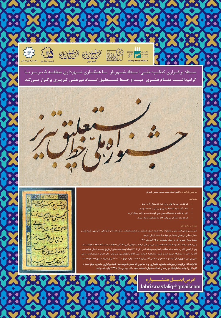 ستاد برگزاري کنگره ملي استاد سيد محمدحسين شهريار با همکاري و مشارکت شهرداري منطقه 5 تبريز در نظر دارد جهت گراميداشت تلاشهاي واضع خط نستعليق استاد ميرعلي تبريزي و پاسداشت مقام شامخ استاد شهريار، جشنواره ملي خط نستعليق تبريز با موضوع اشعار استاد شهريار را برگزار نمايد.
