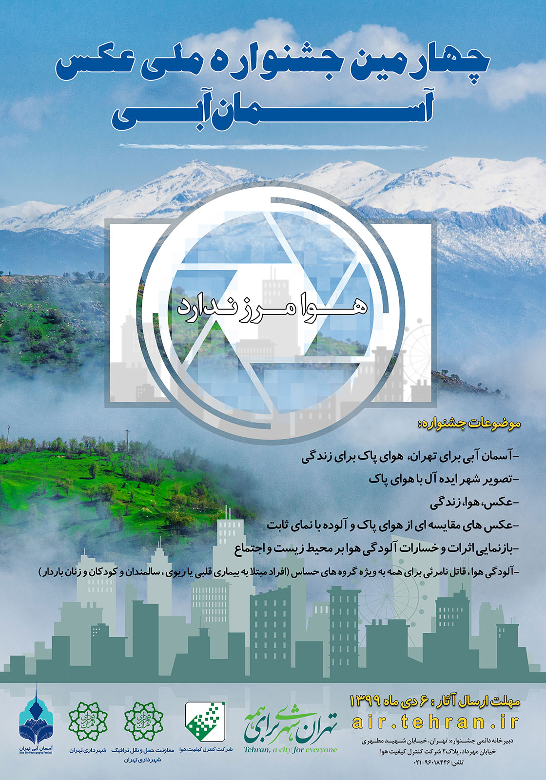 در پي برگزاري سه دوره جشنواره عکس آسمان آبي از علاقهمندان به عکاسي براي شرکت در چهارمين دوره اين جشنواره دعوت به عمل ميآيد.