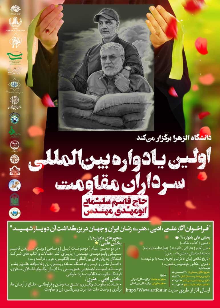 دانشگاه الزهرا با همکاري حوزه هنري و مراکز علمي – فرهنگي داخلي و بين المللي اولين يادواره علمي – فرهنگي ( ادبي – هنري ) زنان ايران و جهان در بزرگداشت سرداران مقاومت حاج قاسم سليماني، ابو مهدي المهندس را برگزار مي کند.