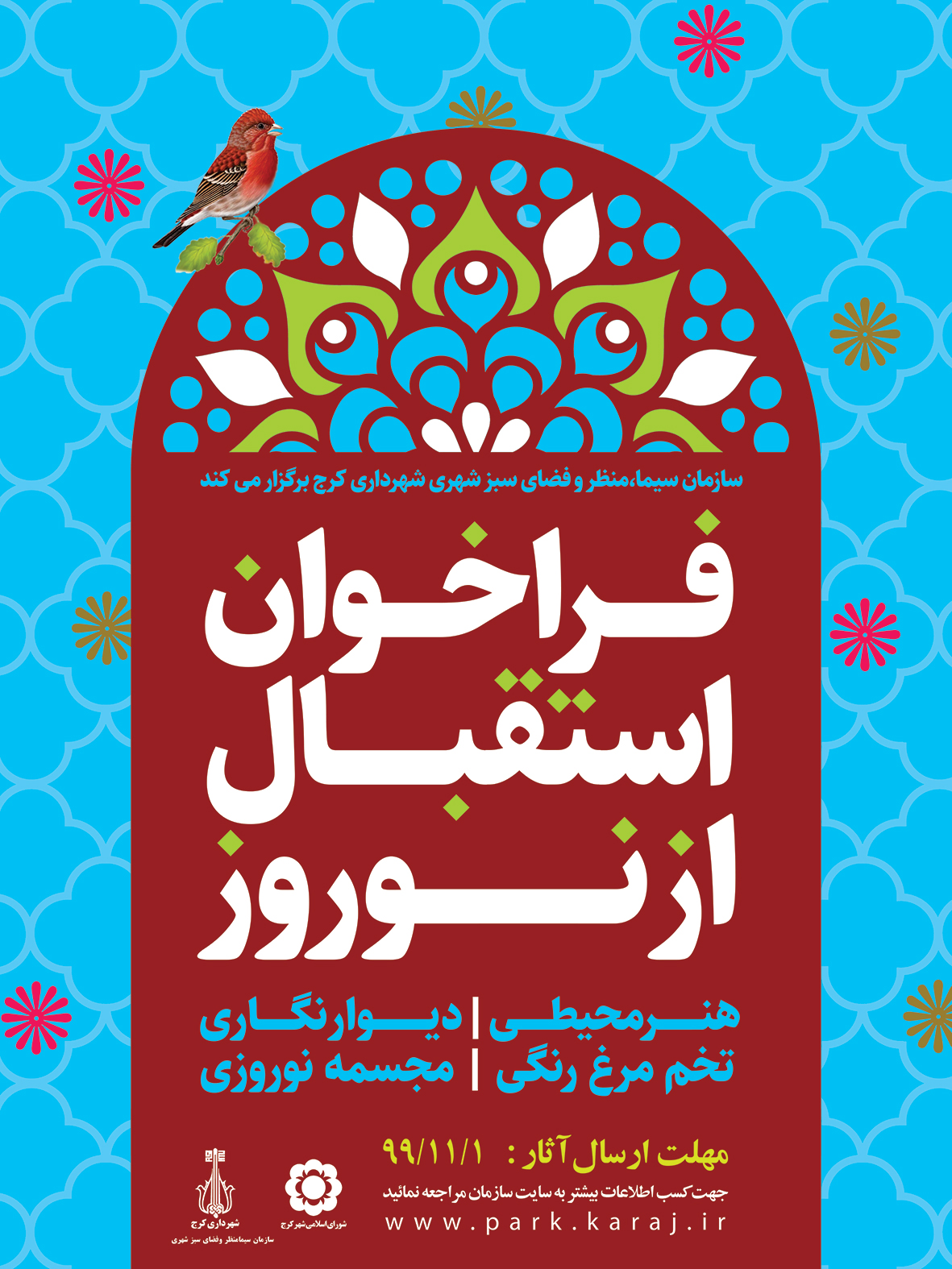 سازمان سيما، منظر و فضاي سبز شهري شهرداري کرج به مناسبت فرارسيدن نوروز 1400 در نظر دارد جشنواره نوروزي برگزار نمايد. اين جشنواره در قالب طرح استقبال از بهار و با هدف ايجاد شور و نشاط بهاري در شهر، از طريق مشارکت هنرمندان و به منظور زينت بخشيدن به فضاهاي شهري، طرح ريزي شده است. به همين منظور از کليه هنرمندان براي مشارکت و ارائه طرح و ايده هاي خلاقانه دعوت بعمل مي آيد تا طرح هاي خود را به دبيرخانه فراخوان ارسال نمايند.