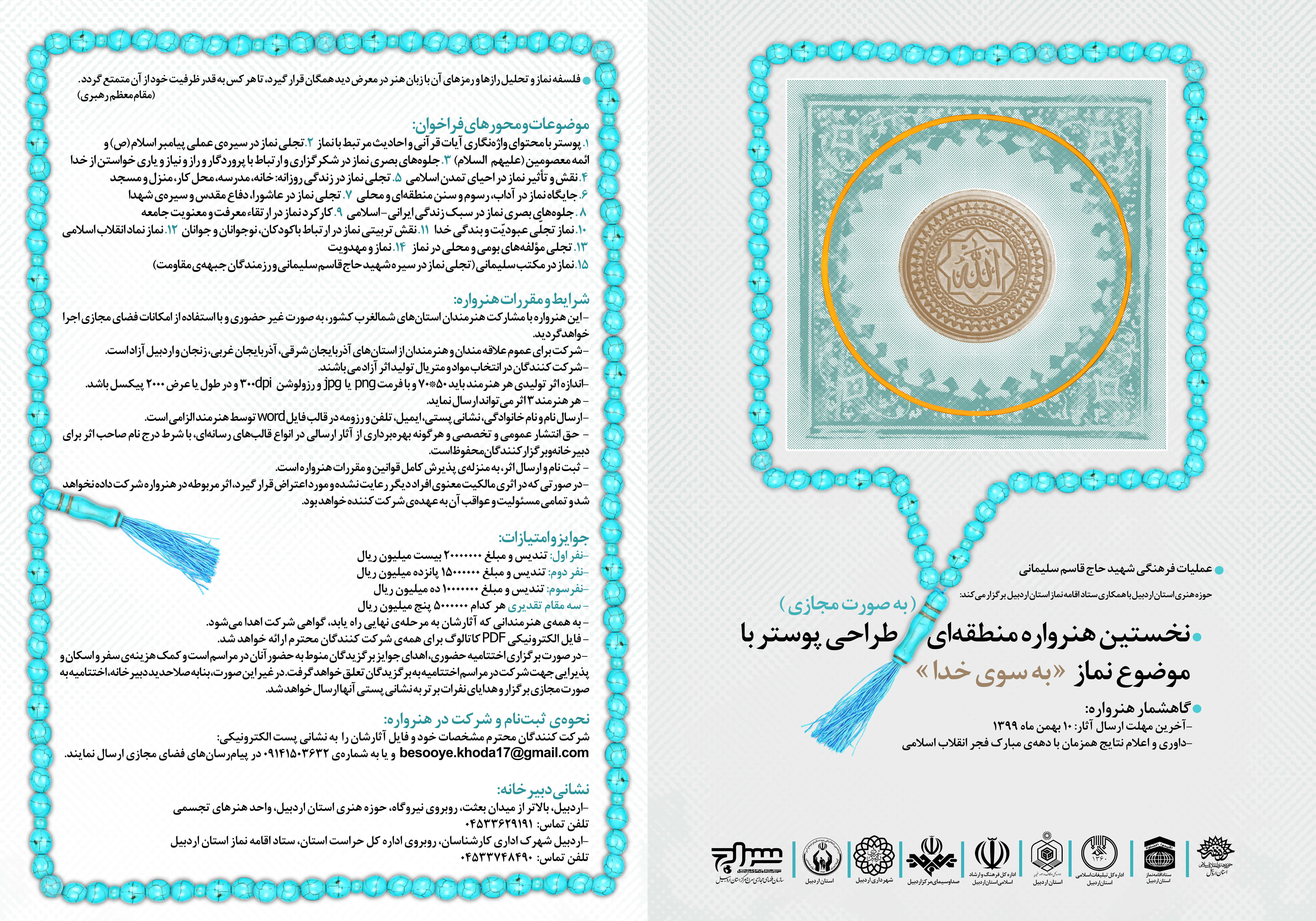 حوزه هنري استان اردبيل با همکاري ستاد اقامه نماز استان، سازمان تبليغات اسلامي استان، ادارهکل اوقاف و امورخيريه، ادارهکل فرهنگ و ارشاد اسلامي، صدا و سيماي مرکز اردبيل، شهرداري اردبيل، کميته امداد امام خميني و موسسه سراج برگزار ميکند: