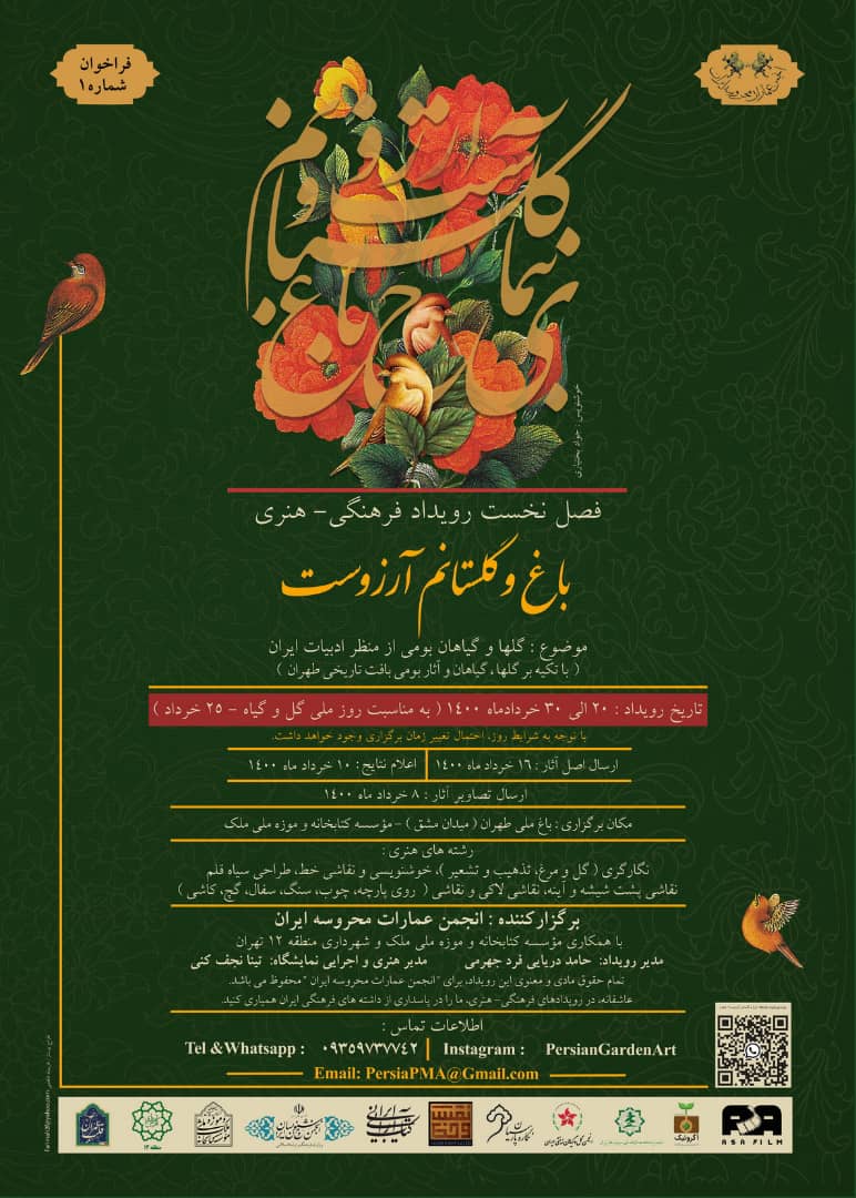 انجمن عمارات محروسه ايران با همکاري مؤسسه کتابخانه و موزه ملي ملک و شهرداري منطقه 12 (قلب طهران)، در نظر دارد فصل نخست نمايشگاه دوره اي ساليانه آثار هنري با موضوع گلها و گياهان بومي ايران را به مناسبت روز ملي گل و گياه (25 خرداد) از تاريخ 20 تا 30 خردادماه 1400 برگزار کند.