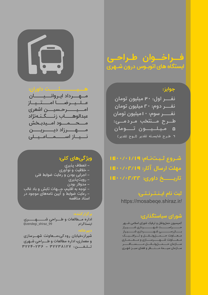 در راستاي پيشبرد اهداف شهرداري کلانشهر شيراز و ترغيب شهروندان به استفاده از حمل و نقل همگاني به عنوان يکي از مهمترين ارکان شهر انسان محور، معاونت حمل و نقل و ترافيک و معاونت شهرسازي و معماري (اداره مطالعات و طراحي شهري) شهرداري شيراز در نظر دارند به منظور ارتقاء کيفيت ايستگاههاي اتوبوس شهري، با همکاري و مشارکت طراحان و بهکارگيري ايدههاي خلاقانه، نسبت به طراحي اين ايستگاهها اقدام نمايند.