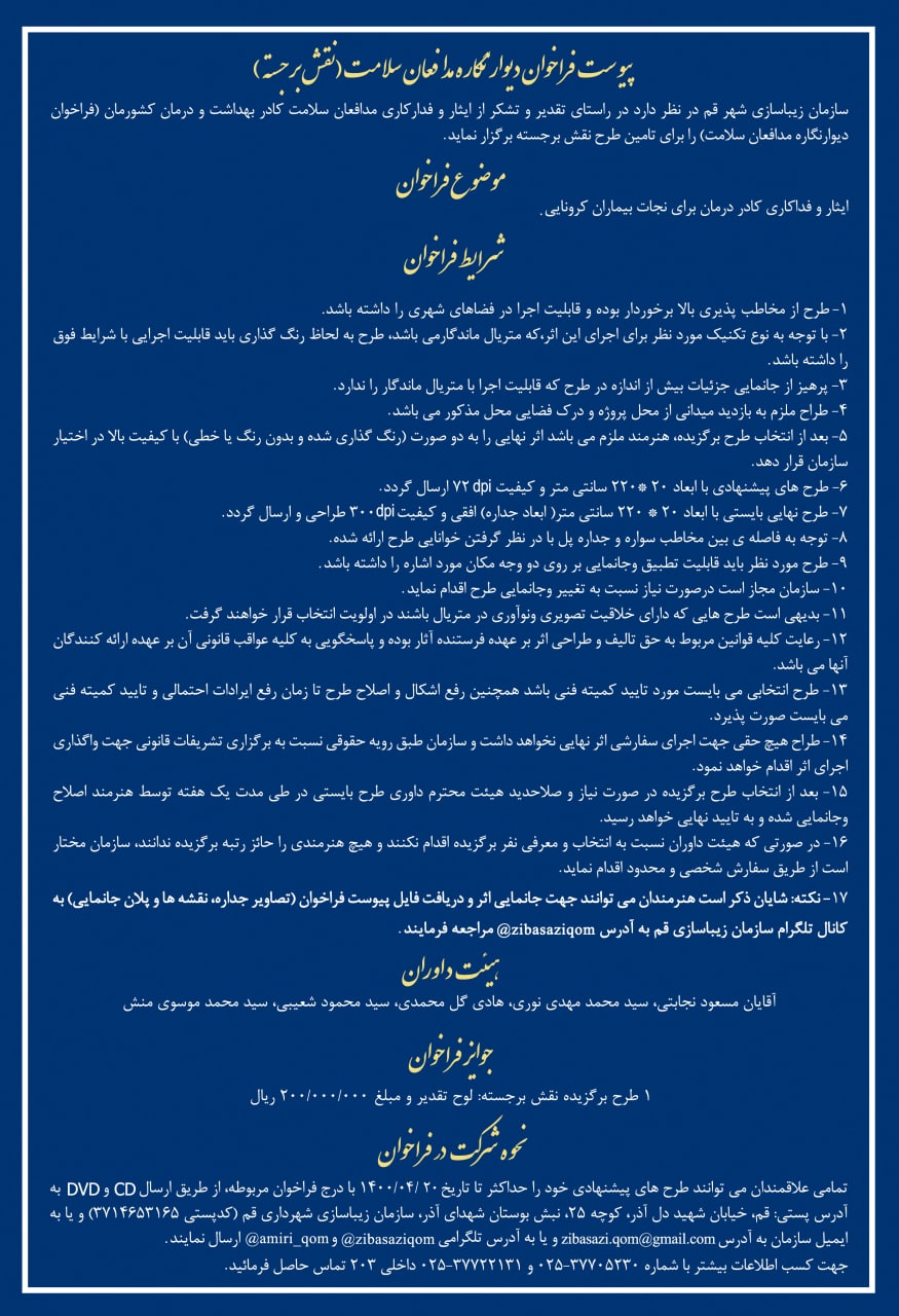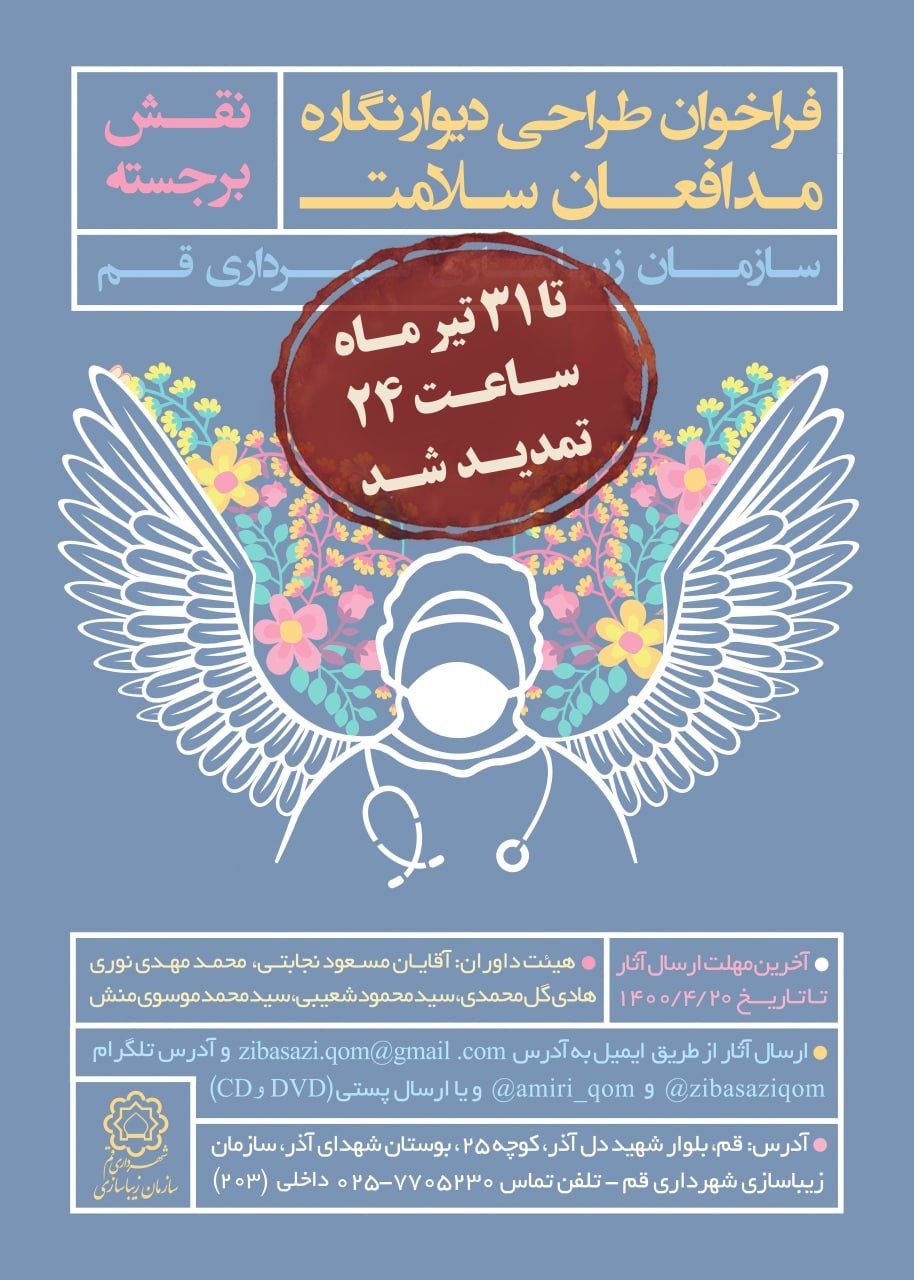 سازمان زيباسازي قم فراخوان طراحي ديوارنگاره مدافعان سلامت را برگزار مي نمايد.