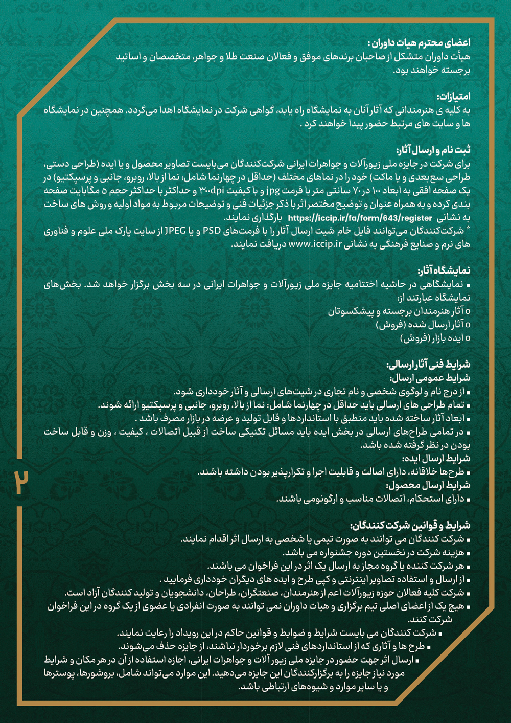 • براي شرکت در جايزه ملي زيورآلات و جواهرات ايراني شرکتکنندگان ميبايست تصاوير محصول و يا ايده (طراحي دستي، طراحي سعبعدي و يا ماکت) خود را در نماهاي مختلف (حداقل در چهارنما شامل: نما از بالا، روبرو، جانبي و پرسپکتيو) در يک صفحه افقي به ابعاد ۱۰۰ در ۷۰ سانتي متر با فرمت jpg و با کيفيت ۳۰۰dpi و حداکثر با حجم حداکثر 5 مگابايت صفحه بندي کرده و به همراه عنوان و توضيح مختصر اثر با ذکر جزئيات فني و توضيحات مربوط به مواد اوليه و روش هاي ساخت به نشاني https://iccip.ir/fa/form/643/register بارگذاري نمايند.