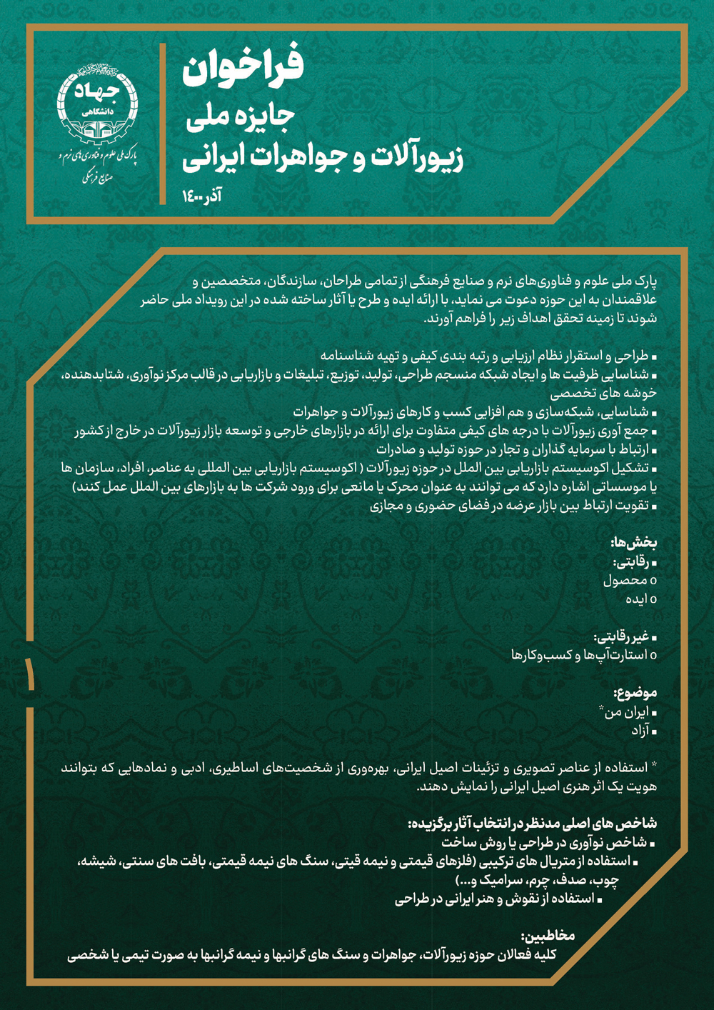 | آزاد | اهداي 40٫000٫000 تومان + تقديرنامه جايزه ملي زيور آلات و جواهرات ايراني + عضويت در پارک ملي علوم و فناوري هاي نرم و صنايع فرهنگي + حضور در نمايشگاه هاي خارجي | |