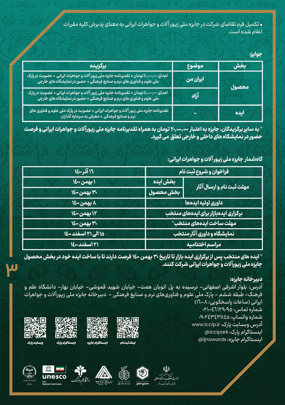 * ايده هاي منتخب پس از برگزاري ايده بازار تا تاريخ 30 بهمن 1400 فرصت دارند تا با ساخت ايده خود در بخش محصول جايزه ملي زيورآلات و جواهرات ايراني شرکت کنند.