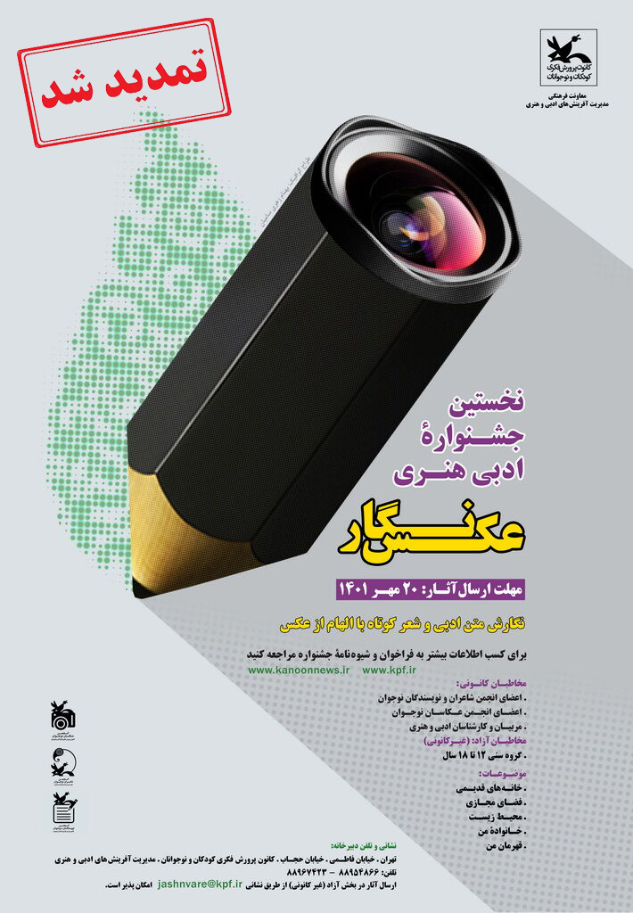 مهلت ارسال آثار به نخستين جشنواره ادبي هنري «عکسنگار» از سوي آفرينشهاي ادبي و هنري کانون پرورش فکري کودکان و نوجوانان تا ۱۰ آبان تمديد شد.