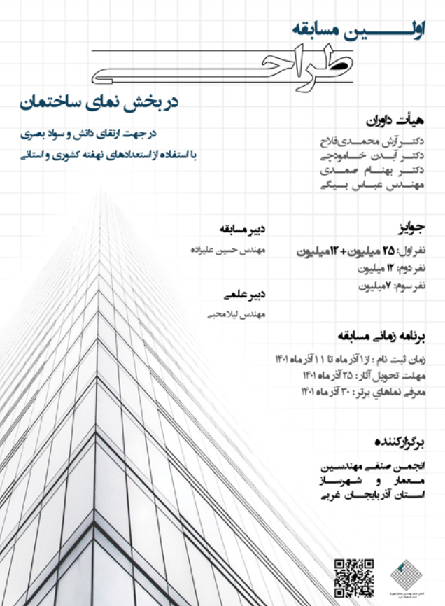 انجمن صنفي مهندسين معمار و شهرساز استان آذربايجان غربي در نظر دارد با بهره مندي از ظرفيت جامعه حرفه اي معماري و جهت ترويج فرهنگ بکار گيري از مصالح بومي و سنتي در طرح هاي نوين ، مسابقه طراحي جداره خارجي نماي ساختمان مسکوني واقع در شهر اروميه را برگزار نمايد. بر اين اساس از معماران و علاقه مندان دعوت مي شود تا طرح پيشنهادي خود را ارائه نمايند.