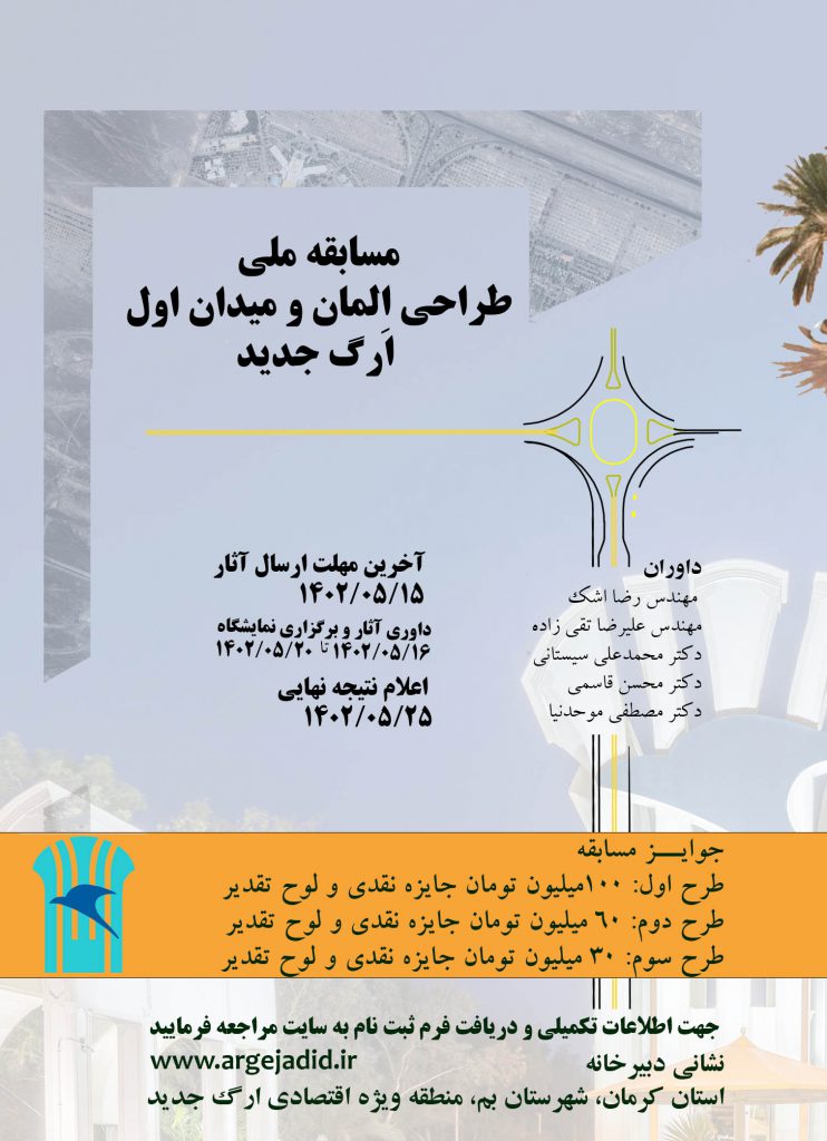 به منظور بهبود سيماي بصري و هويت بخشي به منطقه ويژه اقتصادي ارگ جديد، حوزه معاونت گردشگري شرکت عمران ارگ جديد با هدف معرفي و بهره برداري از ايده هاي اصيل معماري ايراني و تفکرات خلاقانه جديد و ايجاد آثار فرهنگي و هنري ارزنده و ماندگار، اقدام به برگزاري مسابقه ملي طراحي ميدان ورودي و المان واقع در آن مي کند.