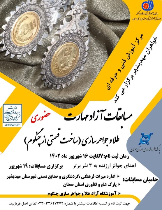 سرپرست اداره ميراثفرهنگي، گردشگري و صنايعدستي شهرستان مهديشهر افزود: مسابقات آزاد مهارت استاني طلا و جواهرسازي (ساخت چنگوم) با همکاري اداره ميراثفرهنگي، گردشگري و صنايعدستي شهرستان مهديشهر، پارک علم و فناوري استان سمنان و آموزشگاه آزاد طلا و جواهرسازي چنگوم برگزار ميشود و علاقهمندان ميتوانند تا 16 شهريورماه براي شرکت در اين مسابقه ثبتنام کنند.